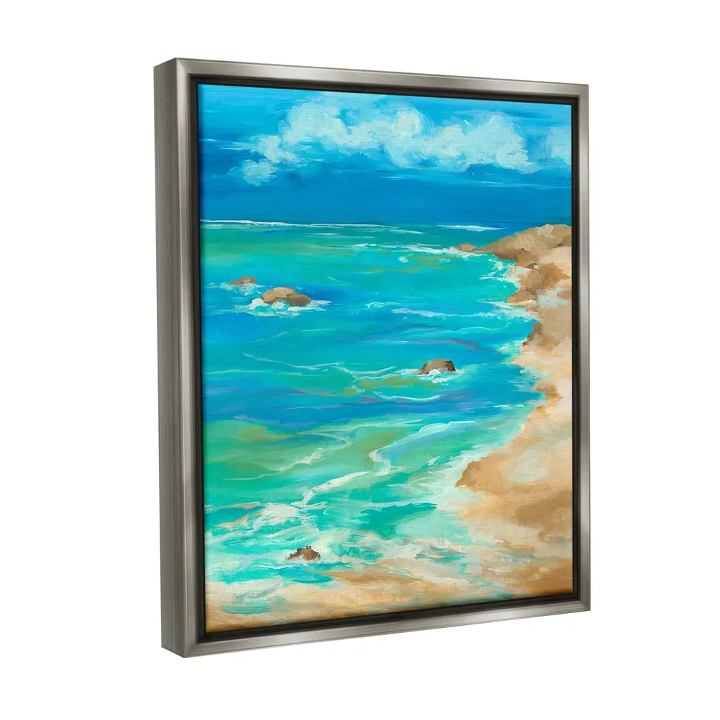 Elevate your home or office to the next level with Stupell Framed Floating Canvas Wall Art. Our premium hand-stretched canvas is mounted securely into a sturdy lightweight frame. The museum-style gap between the wrapped canvas and the box frame gives the illusion of floating artwork. Stupell Wall Art is made in the USA.Features: Dimensions: 17 x 1.7 x 21 Frame, 16 x 1.5 x 20 Canvas ArtFloating Frame Canvas Products are available in sizes 17"x21" and 25"x31". All Floating Frame Canvas Products have a 1.7" Depth.Wall Art is Ready to Hang with Hardware Free Hanging. No Installation required. For Easy Set Up Lean or Layer Artwork on Shelf or Against Wall. Artwork is Permently Fixed into the Frame.Our elevated 1.7" Thick Floating Frame is the perfect complement to our canvas style Wall Art. We use only the highest quality inks in house with industry leading printing solutions. Canvas is hand stretched over a durable wood foundation and then mounted securly into a Modern Box Frame. Made in the USA.Artwork Relates To: Painting, Scenery, Horizon, Cloud, Sea, Water, Shore, Coast, Rocks, CliffDesign by Liz Jardine
