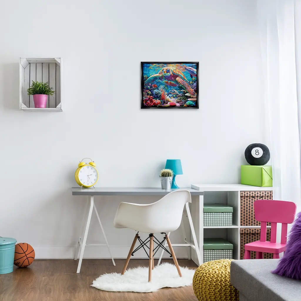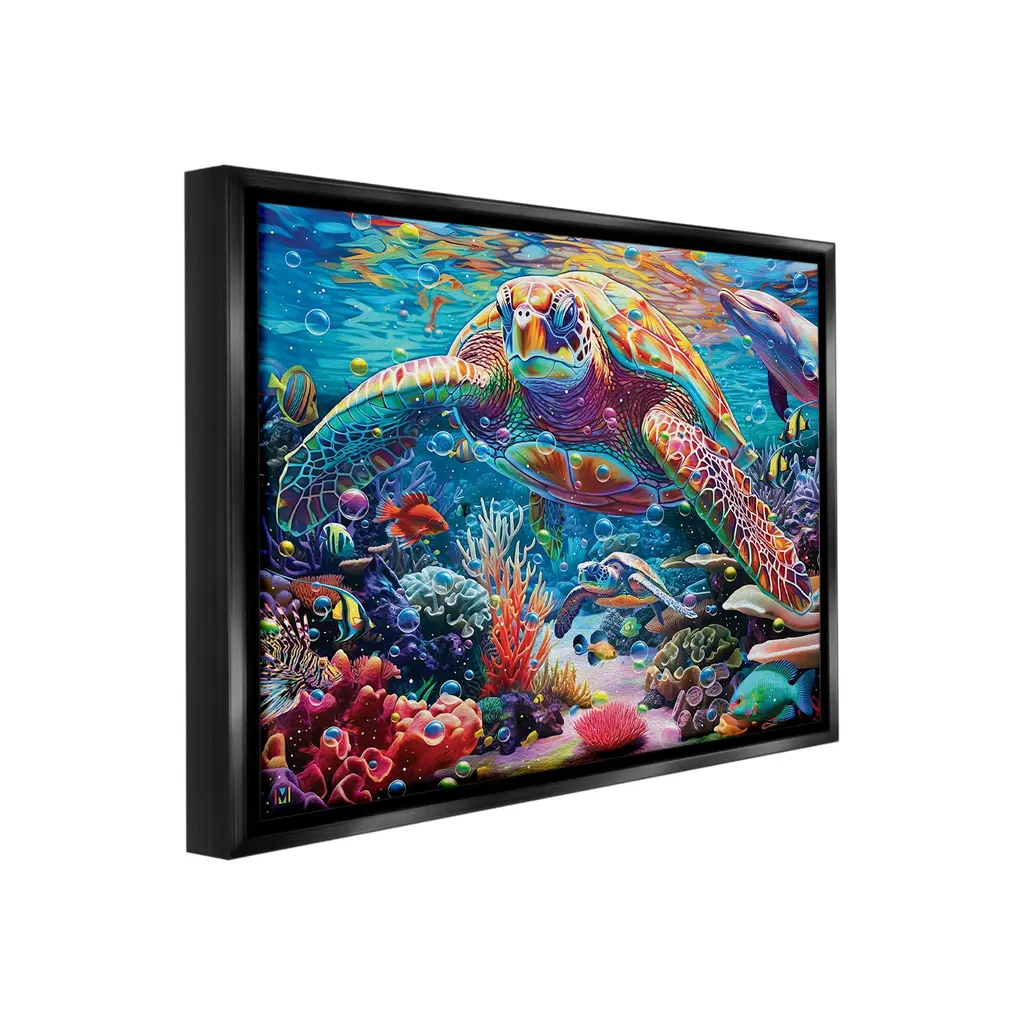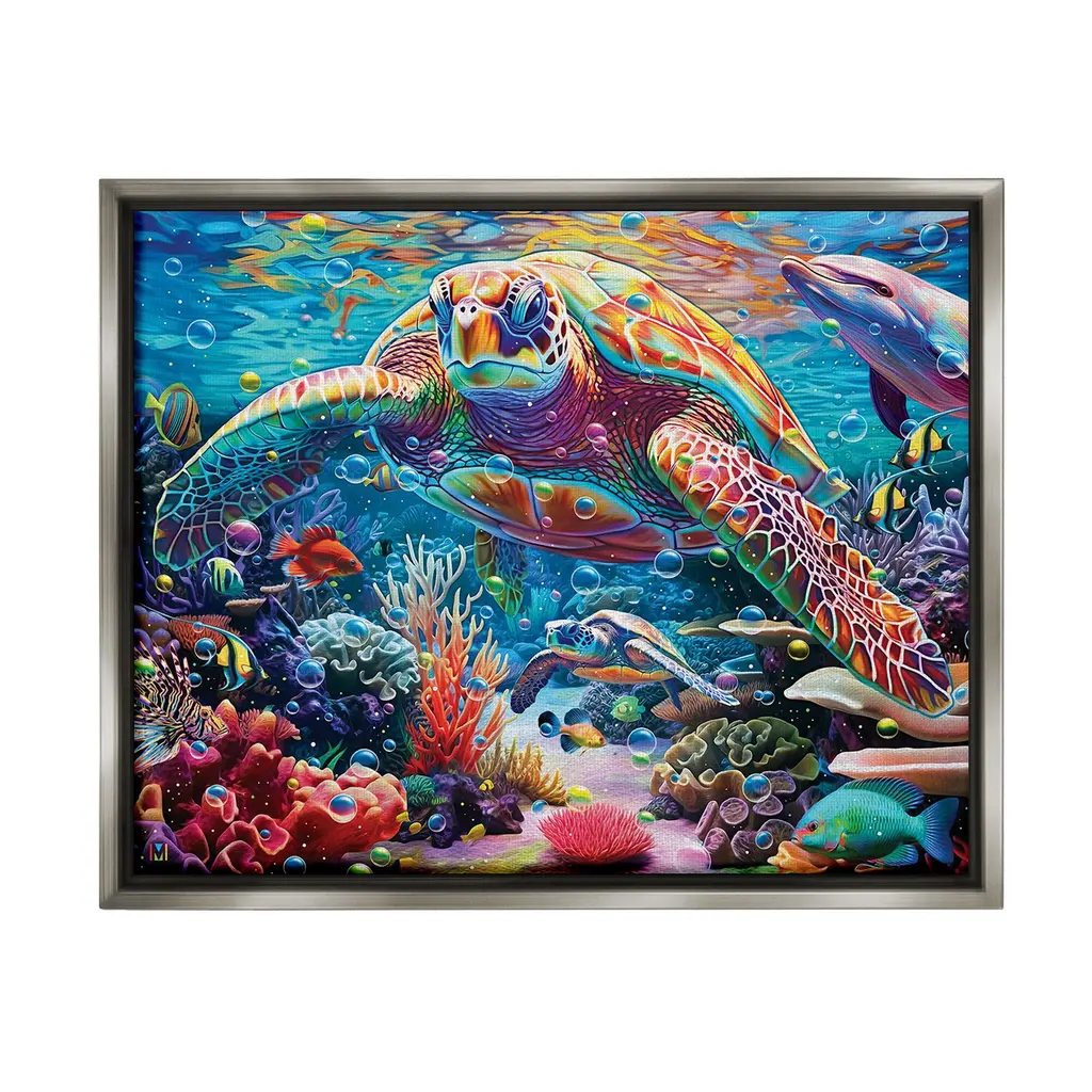 Elevate your home or office to the next level with Stupell Framed Floating Canvas Wall Art. Our premium hand-stretched canvas is mounted securely into a sturdy lightweight frame. The museum-style gap between the wrapped canvas and the box frame gives the illusion of floating artwork. Stupell Wall Art is made in the USA.Features: Dimensions: 21 x 1.7 x 17 Frame, 20 x 1.5 x 16 Canvas ArtFloating Frame Canvas Products are available in sizes 21"x17" and 31"x25". All Floating Frame Canvas Products have a 1.7" Depth.Wall Art is Ready to Hang with Hardware Free Hanging. No Installation required. For Easy Set Up Lean or Layer Artwork on Shelf or Against Wall. Artwork is Permently Fixed into the Frame.Our elevated 1.7" Thick Floating Frame is the perfect complement to our canvas style Wall Art. We use only the highest quality inks in house with industry leading printing solutions. Canvas is hand stretched over a durable wood foundation and then mounted securly into a Modern Box Frame. Made in the USA.Artwork Relates To: Sea, Water, Animal, Reef, Sea Life, Fish, Turtle, Aquatic, DolphinDesign by Michael David Ward