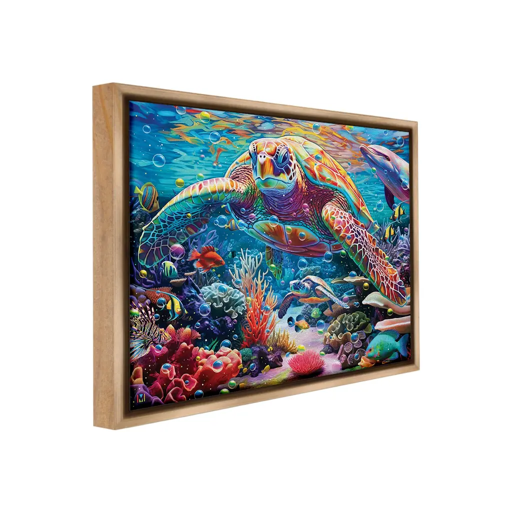 Elevate your home or office to the next level with Stupell Framed Floating Canvas Wall Art. Our premium hand-stretched canvas is mounted securely into a sturdy lightweight frame. The museum-style gap between the wrapped canvas and the box frame gives the illusion of floating artwork. Stupell Wall Art is made in the USA.Features: Dimensions: 21 x 1.7 x 17 Frame, 20 x 1.5 x 16 Canvas ArtFloating Frame Canvas Products are available in sizes 21"x17" and 31"x25". All Floating Frame Canvas Products have a 1.7" Depth.Wall Art is Ready to Hang with Hardware Free Hanging. No Installation required. For Easy Set Up Lean or Layer Artwork on Shelf or Against Wall. Artwork is Permently Fixed into the Frame.Our elevated 1.7" Thick Floating Frame is the perfect complement to our canvas style Wall Art. We use only the highest quality inks in house with industry leading printing solutions. Canvas is hand stretched over a durable wood foundation and then mounted securly into a Modern Box Frame. Made in the USA.Artwork Relates To: Sea, Water, Animal, Reef, Sea Life, Fish, Turtle, Aquatic, DolphinDesign by Michael David Ward