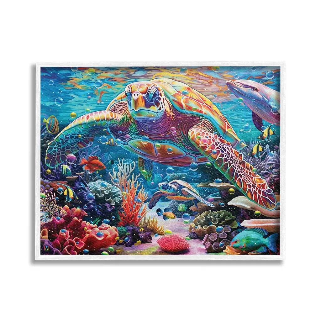 Add dimension to any room with our textured Framed Giclee Artwork. Our framed artwork is securely mounted into a 1.5-inch thick wood grain frame and ready to hang. Frames are available in three alluring styles: black, gray farmhouse and white. In addition, you should check out our oversized options if you want a statement piece. Stupell Wall Art is made in the USA.Features: Dimensions: 14 x 1.5 x 11 FramedFramed Giclee Products are available in the sizes 14"x11", 20"x16" or 30"x24". All Framed Giclee Products have a 1.5" Depth. Wall Art is Ready to Hang with Hardware Free Hanging. No installation required. For Easy Set Up Lean or Layer Artwork on Shelf or Against Wall.Our giclée prints are carefully mounted on a durable MDF backing, and then perfectly finished in a 1.5 inch thick woodgrain frame. Mounted frame colors include black, gray farmhouse and white. Made In USA.Artwork Relates To: Sea, Water, Animal, Reef, Sea Life, Fish, Turtle, Aquatic, DolphinDesign by Michael David Ward
