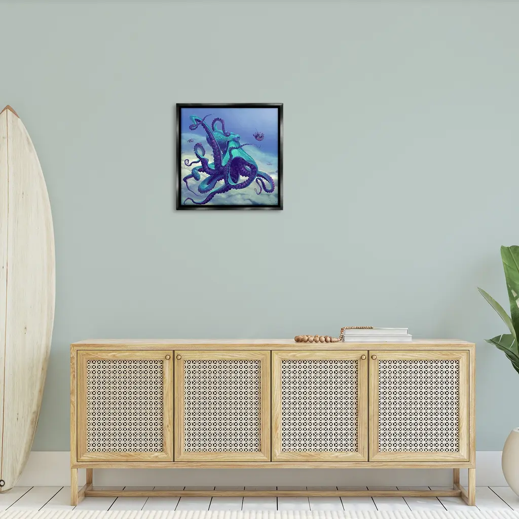 Elevate your home or office to the next level with Stupell Framed Floating Canvas Wall Art. Our premium hand-stretched canvas is mounted securely into a sturdy lightweight frame. The museum-style gap between the wrapped canvas and the box frame gives the illusion of floating artwork. Stupell Wall Art is made in the USA.Features: Dimensions: 18 x 1.7 x 18 Frame, 17 x 1.5 x 17 Canvas ArtFloating Frame Canvas Products are available in sizes 18"x18" and 25"x25". All Floating Frame Canvas Products have a 1.7" Depth.Wall Art is Ready to Hang with Hardware Free Hanging. No Installation required. For Easy Set Up Lean or Layer Artwork on Shelf or Against Wall. Artwork is Permently Fixed into the Frame.Our elevated 1.7" Thick Floating Frame is the perfect complement to our canvas style Wall Art. We use only the highest quality inks in house with industry leading printing solutions. Canvas is hand stretched over a durable wood foundation and then mounted securly into a Modern Box Frame. Made in the USA.Artwork Relates To: Animal, Sea Life, Invertebrate, Octopus, Marine, Ocean, Nautical, BeachDesign by Vlad Mel