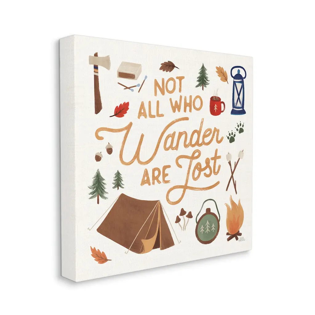 We create our stretched canvas to the highest standards. Using only the highest quality inks and canvas on Mimaki printers, we hand-cut and stretch each piece over a 1.5-inch thick wooden frame for hanging. As a result, the art comes ready to hang on the sturdy ledge with no installation required. Stupell Wall Art is made in the USA.Features: Dimensions: 17 x 1.5 x 17 InchesStretched Canvas Sizes Include Standard: 17 x 1.5 x 17 Large: 24 x 1.5 x 24 X-Large: 30 x 1.5 x 30 Oversized: 36 x 1.5 x 36Wall Art is Ready to Hang with Hardware Free Hanging. No installation required. For Easy Set Up Lean or Layer Artwork on Shelf or Against Wall.Our stretched canvas is created with the highest standards. We use only the highest quality inks and canvas on our in house Mimaki printers, and then hand cut and stretch each piece over a 1.5 inch thick wooden frame for hanging. Made In USA.Artwork Relates To: Boat, Canoe, Camping, Nature, Landscape, Woodland, Adventure, Tent, Cocoa, Compass, Tree, Lantern, Not all who Wander are LostDesign by Laura Marshall