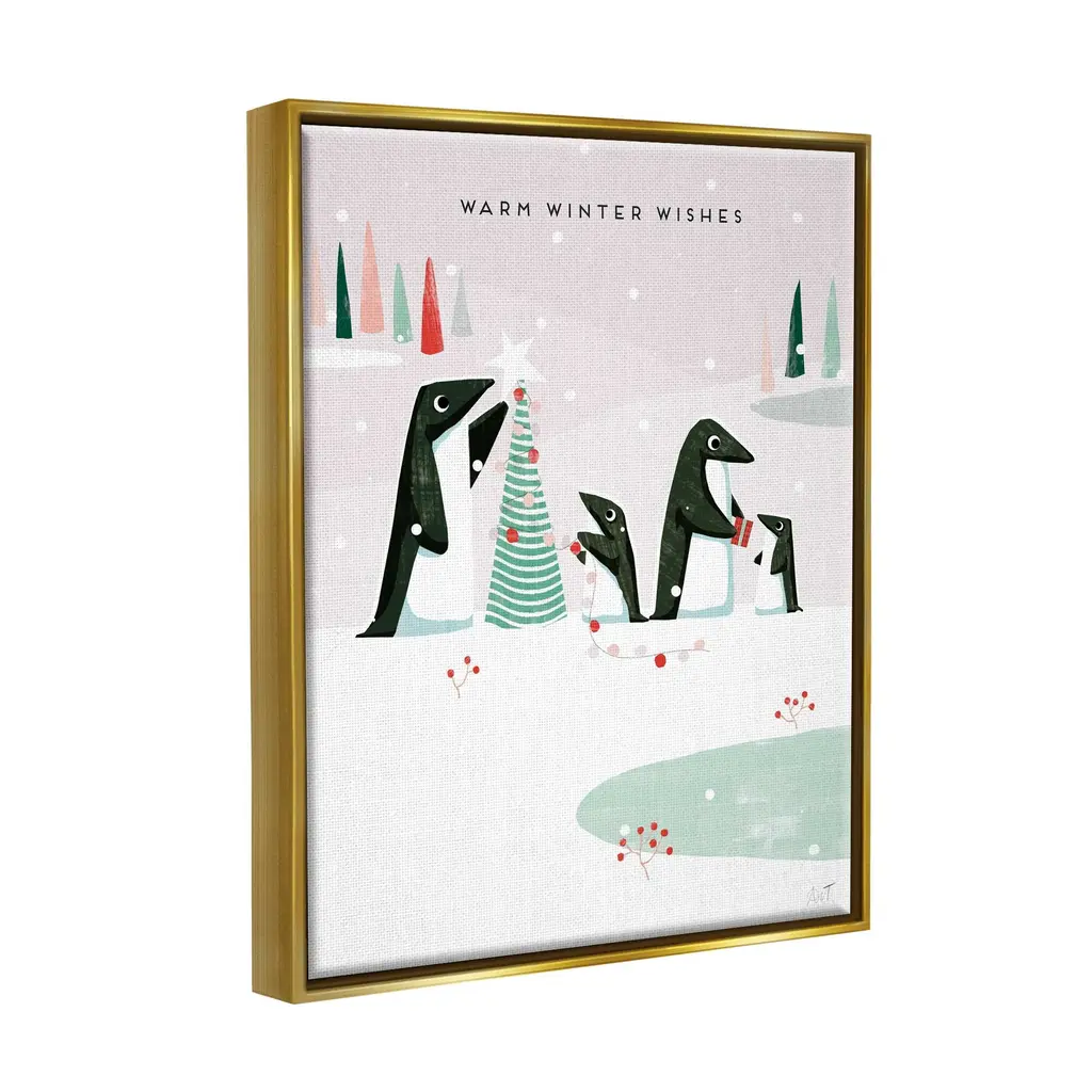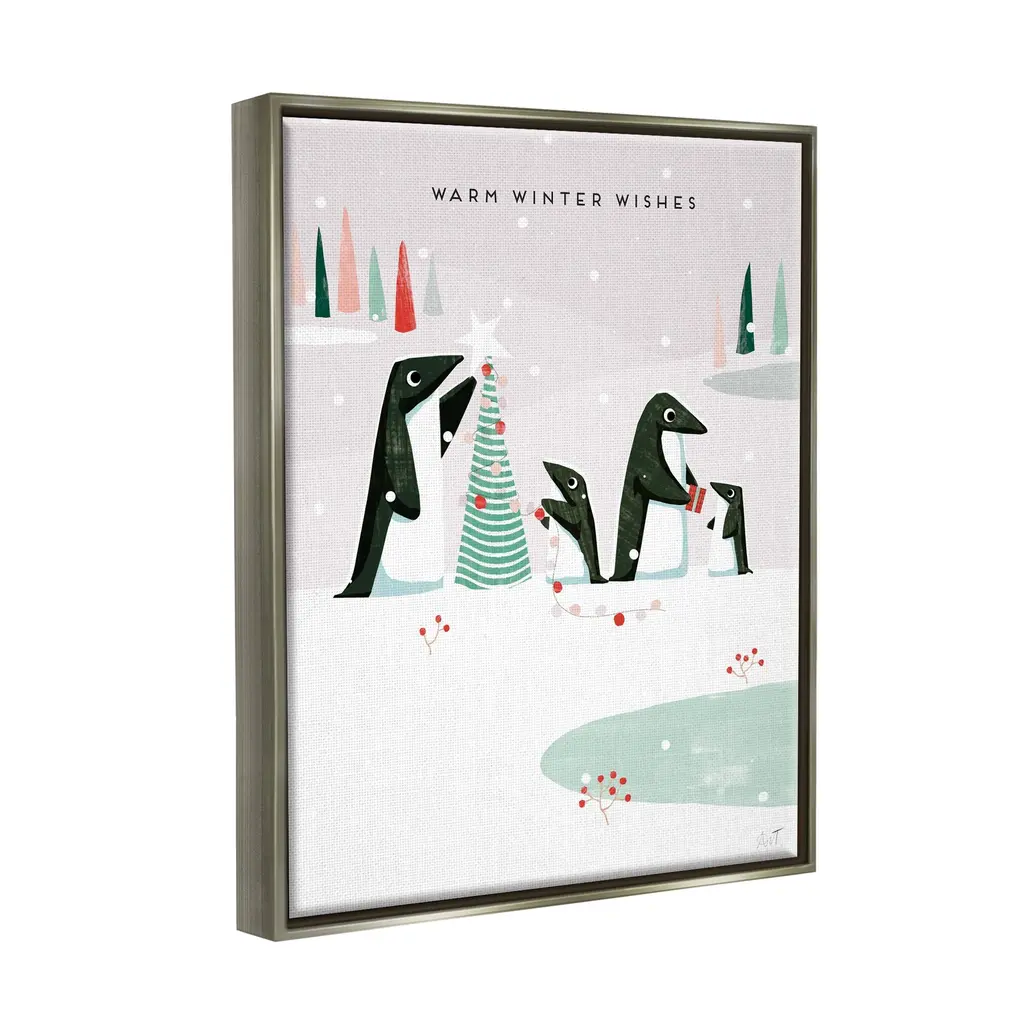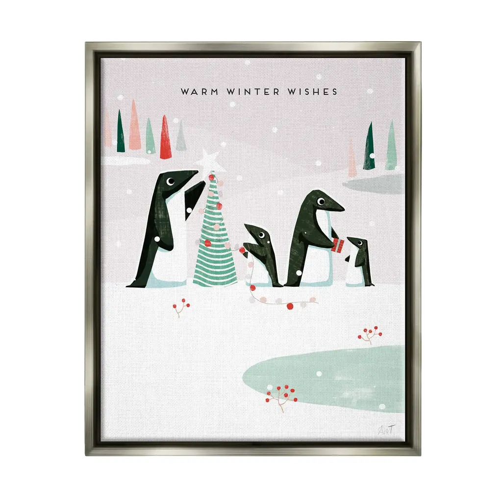 Elevate your home or office to the next level with Stupell Framed Floating Canvas Wall Art. Our premium hand-stretched canvas is mounted securely into a sturdy lightweight frame. The museum-style gap between the wrapped canvas and the box frame gives the illusion of floating artwork. Stupell Wall Art is made in the USA.Features: Dimensions: 17 x 1.7 x 21 Frame, 16 x 1.5 x 20 Canvas ArtFloating Frame Sizes Include Standard: 17 x 1.7 x 21 Oversized: 25 x 1.7 x 31Wall Art is Ready to Hang - No Installation or Hardware Needed. For Easy Set Up Lean or Layer Artwork on Shelf or Against Wall.Our elevated 1.7" Thick Floating Frame is the perfect complement to our canvas style Wall Art. We use only the highest quality inks in house with industry leading printing solutions. Canvas is hand stretched over a durable wood foundation and then mounted securly into a Modern Box Frame. Made in the USA.Artwork Relates To: Penguin, Christmas Tree, Winter, Snow, Holiday, Seasonal, Bird, Animal, Warm Winter WishesDesign by Andrew Thornton