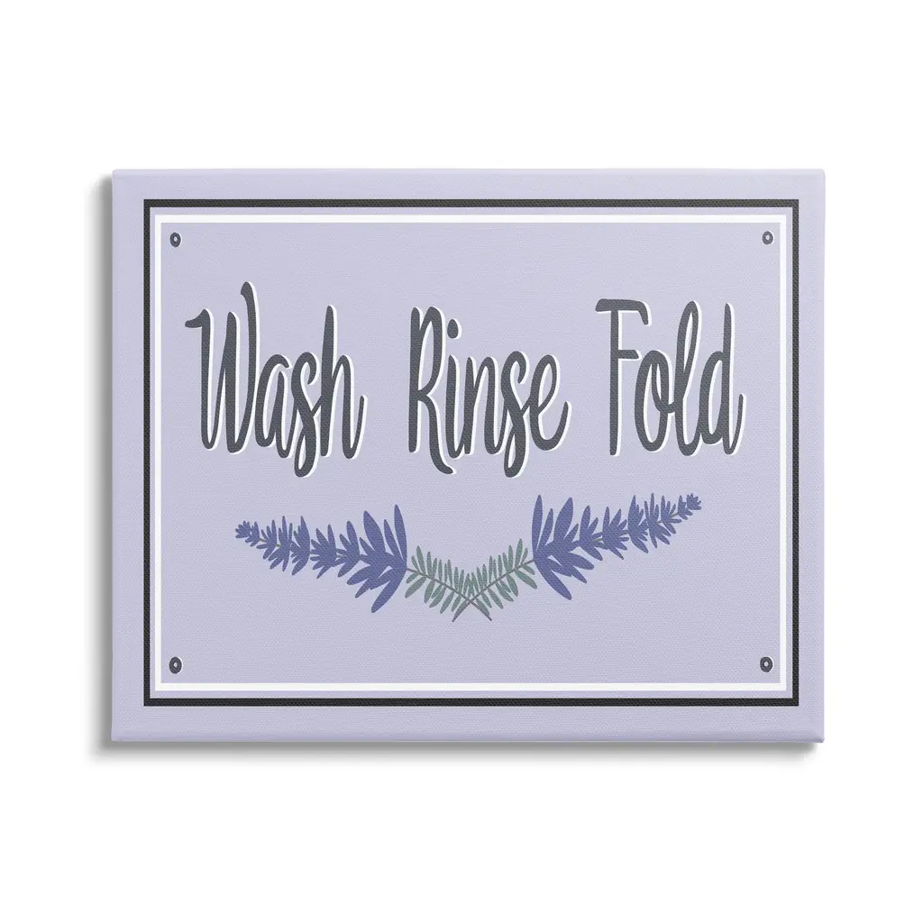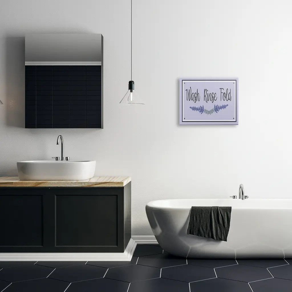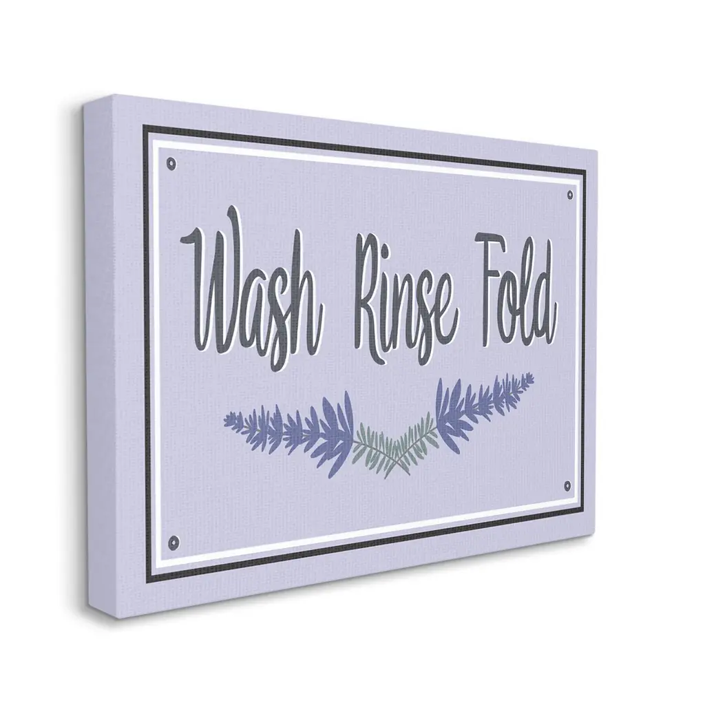 We create our stretched canvas to the highest standards. Using only the highest quality inks and canvas on Mimaki printers, we hand-cut and stretch each piece over a 1.5-inch thick wooden frame for hanging. As a result, the art comes ready to hang on the sturdy ledge with no installation required. Stupell Wall Art is made in the USA.Features: Dimensions: 20 x 1.5 x 16 InchesStretched Canvas Sizes Include Standard: 20 x 1.5 x 16 Large: 30 x 1.5 x 20 X-Large: 40 x 1.5 x 30 Oversized: 48 x 1.5 x 36Wall Art is Ready to Hang - No Installation or Hardware Needed. For Easy Set Up Lean or Layer Artwork on Shelf or Against Wall.Our stretched canvas is created with the highest standards. We use only the highest quality inks and canvas on our in house Mimaki printers, and then hand cut and stretch each piece over a 1.5 inch thick wooden frame for hanging. Made In USA.Artwork Relates To: Lavender, Purple, Bathroom, Laundry, Wash Rinse FoldDesign by Darlene Seale