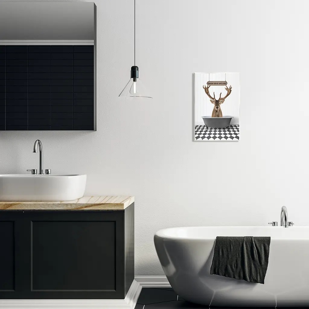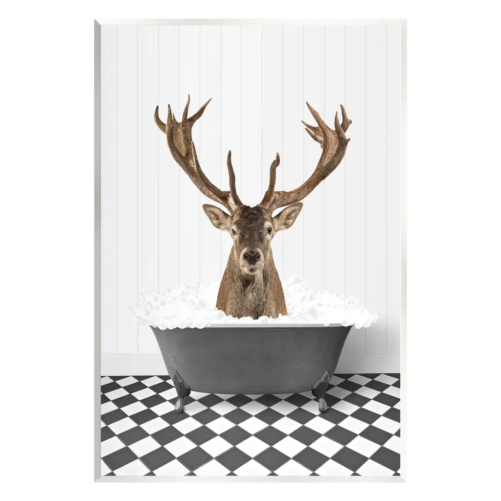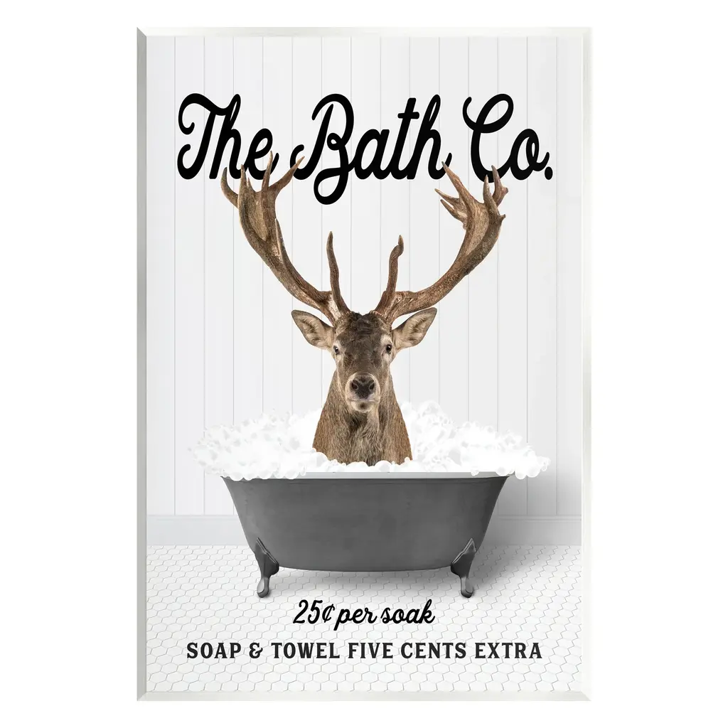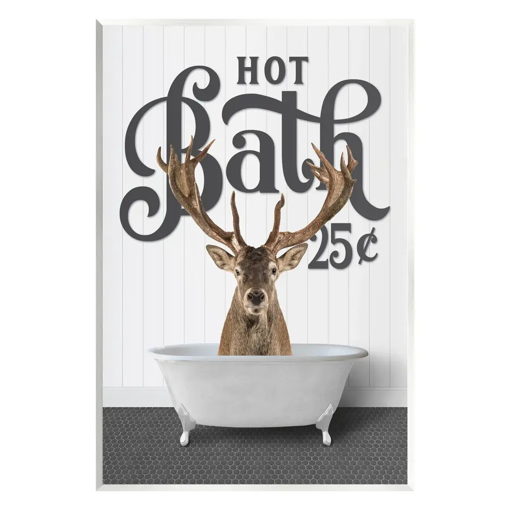 Our wall plaques start as high-quality lithograph prints mounted on durable 0.5-inch thick MDF wood. Each piece is hand finished and comes with a fresh layer of white foil on the sides to give it a crisp, clean look. Plaques arrive ready to hang without installation and come with removable plastic corners to keep them from damage in transit. Stupell Wall Art is made in the USA.Features: Dimensions: 10 x 0.5 x 15 InchesWall Plaque Sizes Include Standard: 10 x 0.5 x 15 Oversized: 13 x 0.5 x 19Wall Art is Ready to Hang with Hardware Free Hanging. No installation required. For Easy Set Up Lean or Layer Artwork on Shelf or Against Wall.All of our wall plaques start off as high quality lithograph prints that are then mounted on durable 0.5 inch thick MDF wood. Each piece is hand finished and comes with a fresh layer of foil on the sides to give it a crisp clean look. Made In USA.Artwork Relates To: Animal, Mammal, Wildlife, Bathroom, Rustic, Bathtub, Wash Your Antlers, Deer, ElkDesign by Lettered and Lined