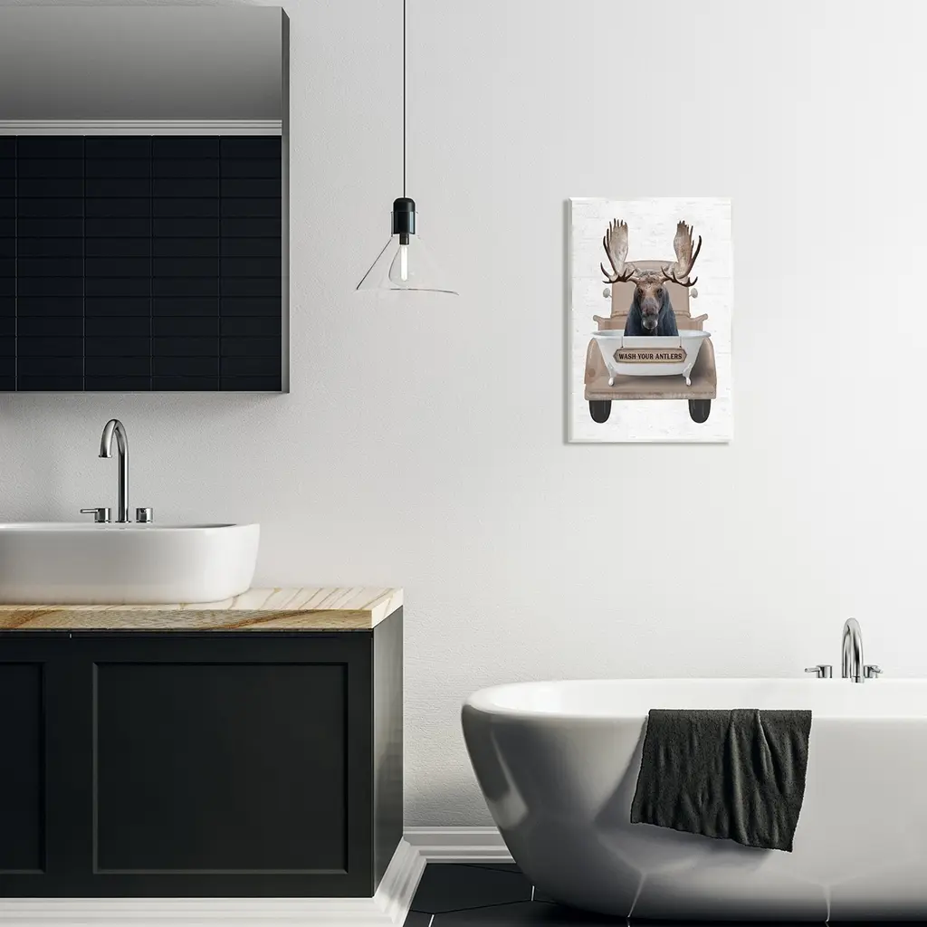 Our wall plaques start as high-quality lithograph prints mounted on durable 0.5-inch thick MDF wood. Each piece is hand finished and comes with a fresh layer of white foil on the sides to give it a crisp, clean look. Plaques arrive ready to hang without installation and come with removable plastic corners to keep them from damage in transit. Stupell Wall Art is made in the USA.Features: Dimensions: 10 x 0.5 x 15 InchesWall Plaque Sizes Include Standard: 10 x 0.5 x 15 Oversized: 13 x 0.5 x 19Wall Art is Ready to Hang with Hardware Free Hanging. No installation required. For Easy Set Up Lean or Layer Artwork on Shelf or Against Wall.All of our wall plaques start off as high quality lithograph prints that are then mounted on durable 0.5 inch thick MDF wood. Each piece is hand finished and comes with a fresh layer of foil on the sides to give it a crisp clean look. Made In USA.Artwork Relates To: Animal, Mammal, Wildlife, Pickup Truck, Bathroom, Rustic, Moose, Wash Your AntlersDesign by Lettered and Lined