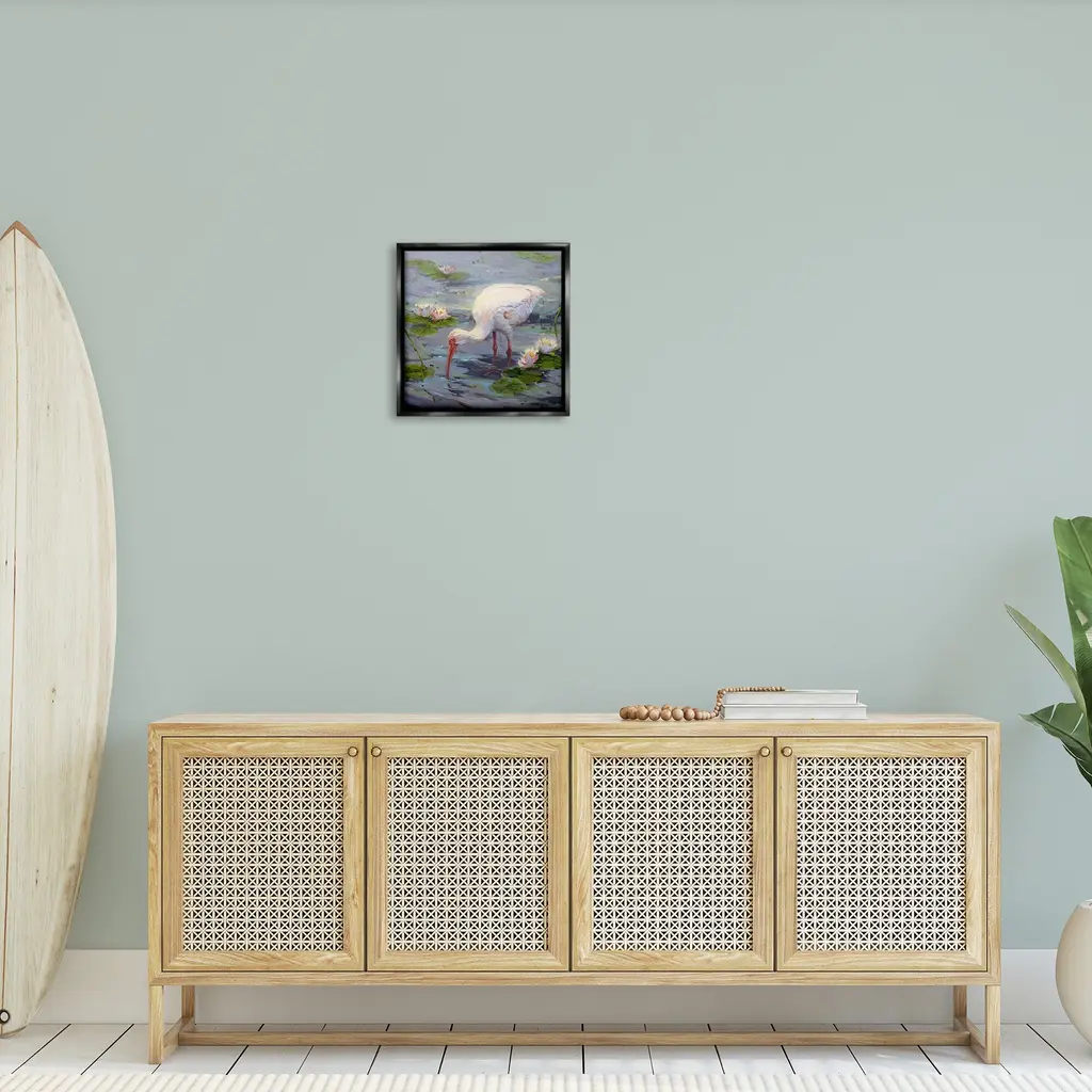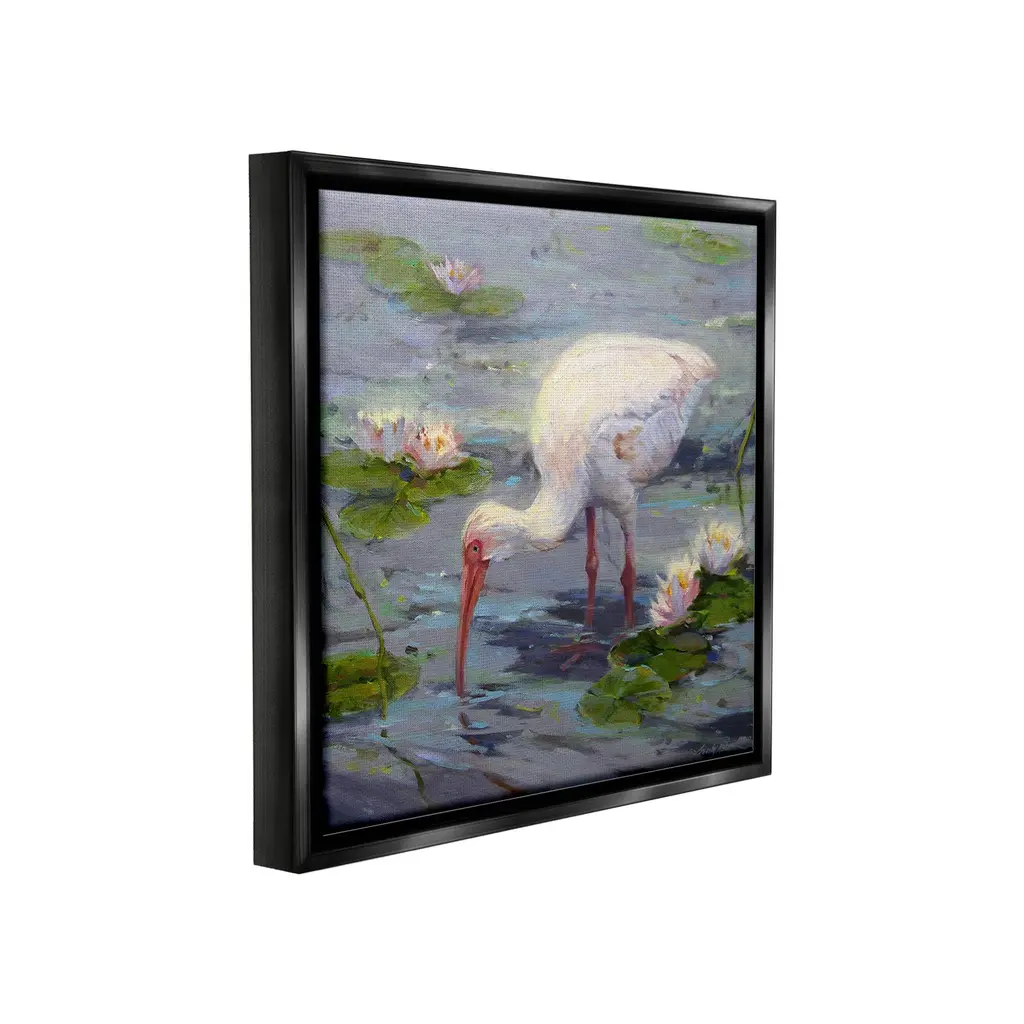 Elevate your home or office to the next level with Stupell Framed Floating Canvas Wall Art. Our premium hand-stretched canvas is mounted securely into a sturdy lightweight frame. The museum-style gap between the wrapped canvas and the box frame gives the illusion of floating artwork. Stupell Wall Art is made in the USA.Features: Dimensions: 18 x 1.7 x 18 Frame, 17 x 1.5 x 17 Canvas ArtFloating Frame Canvas Products are available in sizes 18"x18" and 25"x25". All Floating Frame Canvas Products have a 1.7" Depth.Wall Art is Ready to Hang with Hardware Free Hanging. No Installation required. For Easy Set Up Lean or Layer Artwork on Shelf or Against Wall. Artwork is Permently Fixed into the Frame.Our elevated 1.7" Thick Floating Frame is the perfect complement to our canvas style Wall Art. We use only the highest quality inks in house with industry leading printing solutions. Canvas is hand stretched over a durable wood foundation and then mounted securly into a Modern Box Frame. Made in the USA.Artwork Relates To: Animal, Beak, Bird, Waterfowl, Painting, Flower, Plant, Crane Bird, Lily, Pond Lily, Stork, LotusDesign by Sandy Nelson