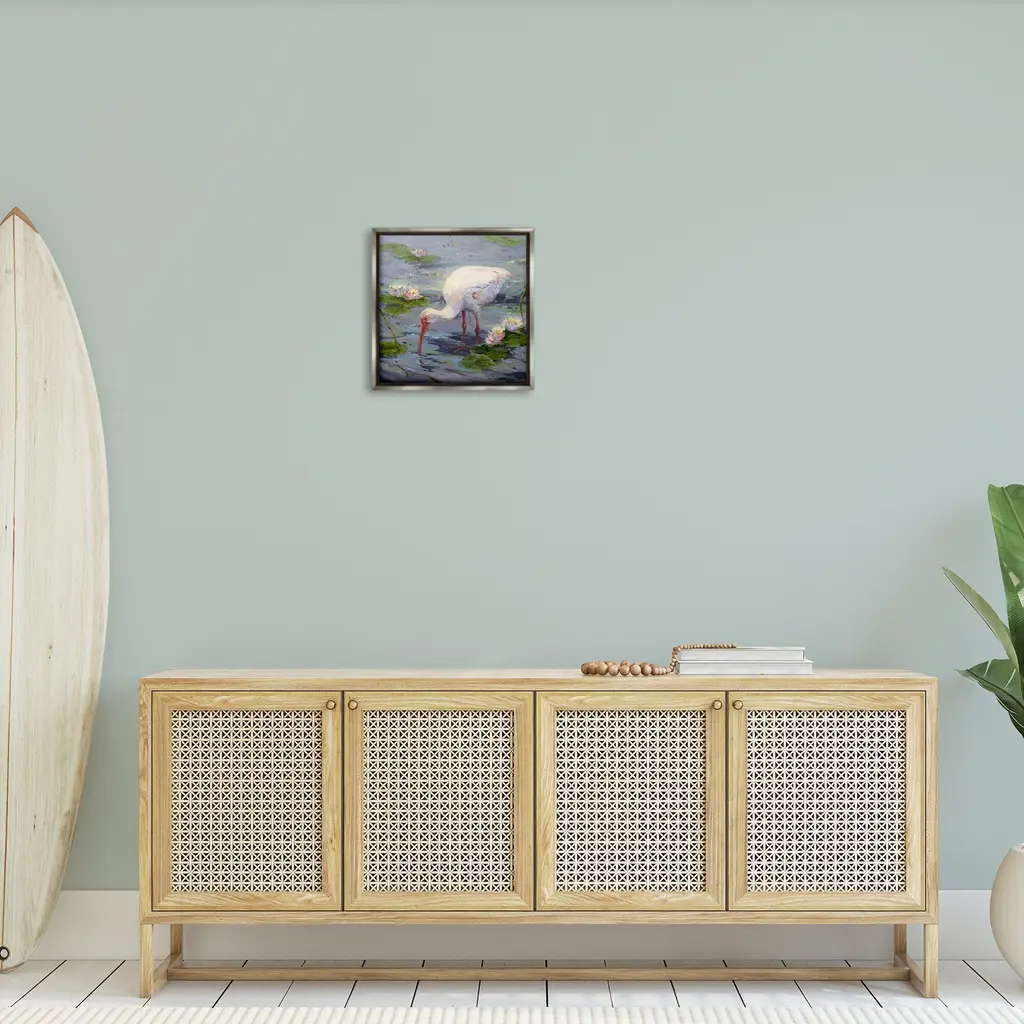 Elevate your home or office to the next level with Stupell Framed Floating Canvas Wall Art. Our premium hand-stretched canvas is mounted securely into a sturdy lightweight frame. The museum-style gap between the wrapped canvas and the box frame gives the illusion of floating artwork. Stupell Wall Art is made in the USA.Features: Dimensions: 18 x 1.7 x 18 Frame, 17 x 1.5 x 17 Canvas ArtFloating Frame Canvas Products are available in sizes 18"x18" and 25"x25". All Floating Frame Canvas Products have a 1.7" Depth.Wall Art is Ready to Hang with Hardware Free Hanging. No Installation required. For Easy Set Up Lean or Layer Artwork on Shelf or Against Wall. Artwork is Permently Fixed into the Frame.Our elevated 1.7" Thick Floating Frame is the perfect complement to our canvas style Wall Art. We use only the highest quality inks in house with industry leading printing solutions. Canvas is hand stretched over a durable wood foundation and then mounted securly into a Modern Box Frame. Made in the USA.Artwork Relates To: Animal, Beak, Bird, Waterfowl, Painting, Flower, Plant, Crane Bird, Lily, Pond Lily, Stork, LotusDesign by Sandy Nelson