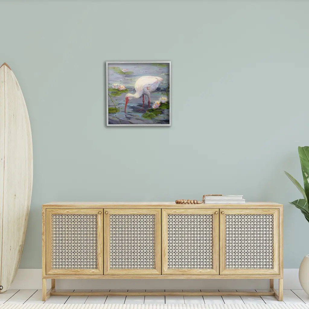 Add dimension to any room with our textured Framed Giclee Artwork. Our framed artwork is securely mounted into a 1.5-inch thick wood grain frame and ready to hang. Frames are available in three alluring styles: black, gray farmhouse and white. In addition, you should check out our oversized options if you want a statement piece. Stupell Wall Art is made in the USA.Features: Dimensions: 12 x 1.5 x 12 FramedFramed Giclee Product Sizes Include 12"x12", 17"x17", and 24"x24". Framed Giclee Products have a 1.5" Depth. Wall Art is Ready to Hang with Hardware Free Hanging. No installation required. For Easy Set Up Lean or Layer Artwork on Shelf or Against Wall.Our giclée prints are carefully mounted on a durable MDF backing, and then perfectly finished in a 1.5 inch thick woodgrain frame. Mounted frame colors include black, gray farmhouse and white. Made In USA.Artwork Relates To: Animal, Beak, Bird, Waterfowl, Painting, Flower, Plant, Crane Bird, Lily, Pond Lily, Stork, LotusDesign by Sandy Nelson