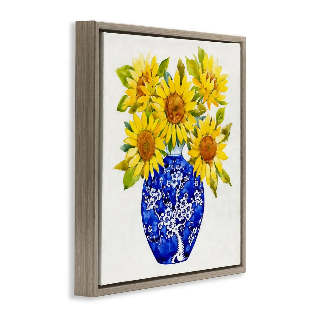 Elevate your home or office to the next level with Stupell Framed Floating Canvas Wall Art. Our premium hand-stretched canvas is mounted securely into a sturdy lightweight frame. The museum-style gap between the wrapped canvas and the box frame gives the illusion of floating artwork. Stupell Wall Art is made in the USA.Features: Dimensions: 18 x 1.7 x 18 Frame, 17 x 1.5 x 17 Canvas ArtFloating Frame Canvas Products are available in sizes 18"x18" and 25"x25". All Floating Frame Canvas Products have a 1.7" Depth.Wall Art is Ready to Hang with Hardware Free Hanging. No Installation required. For Easy Set Up Lean or Layer Artwork on Shelf or Against Wall. Artwork is Permently Fixed into the Frame.Our elevated 1.7" Thick Floating Frame is the perfect complement to our canvas style Wall Art. We use only the highest quality inks in house with industry leading printing solutions. Canvas is hand stretched over a durable wood foundation and then mounted securly into a Modern Box Frame. Made in the USA.Artwork Relates To: Flower, Blossom, Sunflower, Vase, Pattern, Country, BlossomDesign by Tim OToole