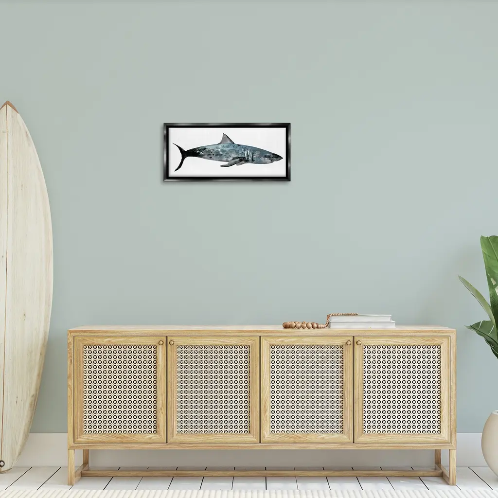 Elevate your home or office to the next level with Stupell Framed Floating Canvas Wall Art. Our premium hand-stretched canvas is mounted securely into a sturdy lightweight frame. The museum-style gap between the wrapped canvas and the box frame gives the illusion of floating artwork. Stupell Wall Art is made in the USA.Features: Dimensions: 25 x 1.7 x 11 Frame, 24 x 1.5 x 10 Canvas ArtFloating Frame Canvas Products are available in sizes 25"x11" and 31"x14". All Floating Frame Canvas Products have a 1.7" Depth.Wall Art is Ready to Hang with Hardware Free Hanging. No Installation required. For Easy Set Up Lean or Layer Artwork on Shelf or Against Wall. Artwork is Permently Fixed into the Frame.Our elevated 1.7" Thick Floating Frame is the perfect complement to our canvas style Wall Art. We use only the highest quality inks in house with industry leading printing solutions. Canvas is hand stretched over a durable wood foundation and then mounted securly into a Modern Box Frame. Made in the USA.Artwork Relates To: Nautical, Marine Life, Sea Life, Shark, AnimalDesign by Stellar Design Studio