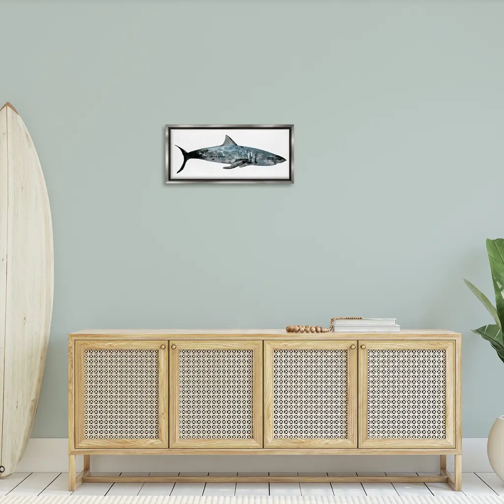 Elevate your home or office to the next level with Stupell Framed Floating Canvas Wall Art. Our premium hand-stretched canvas is mounted securely into a sturdy lightweight frame. The museum-style gap between the wrapped canvas and the box frame gives the illusion of floating artwork. Stupell Wall Art is made in the USA.Features: Dimensions: 25 x 1.7 x 11 Frame, 24 x 1.5 x 10 Canvas ArtFloating Frame Canvas Products are available in sizes 25"x11" and 31"x14". All Floating Frame Canvas Products have a 1.7" Depth.Wall Art is Ready to Hang with Hardware Free Hanging. No Installation required. For Easy Set Up Lean or Layer Artwork on Shelf or Against Wall. Artwork is Permently Fixed into the Frame.Our elevated 1.7" Thick Floating Frame is the perfect complement to our canvas style Wall Art. We use only the highest quality inks in house with industry leading printing solutions. Canvas is hand stretched over a durable wood foundation and then mounted securly into a Modern Box Frame. Made in the USA.Artwork Relates To: Nautical, Marine Life, Sea Life, Shark, AnimalDesign by Stellar Design Studio