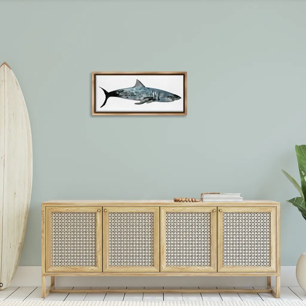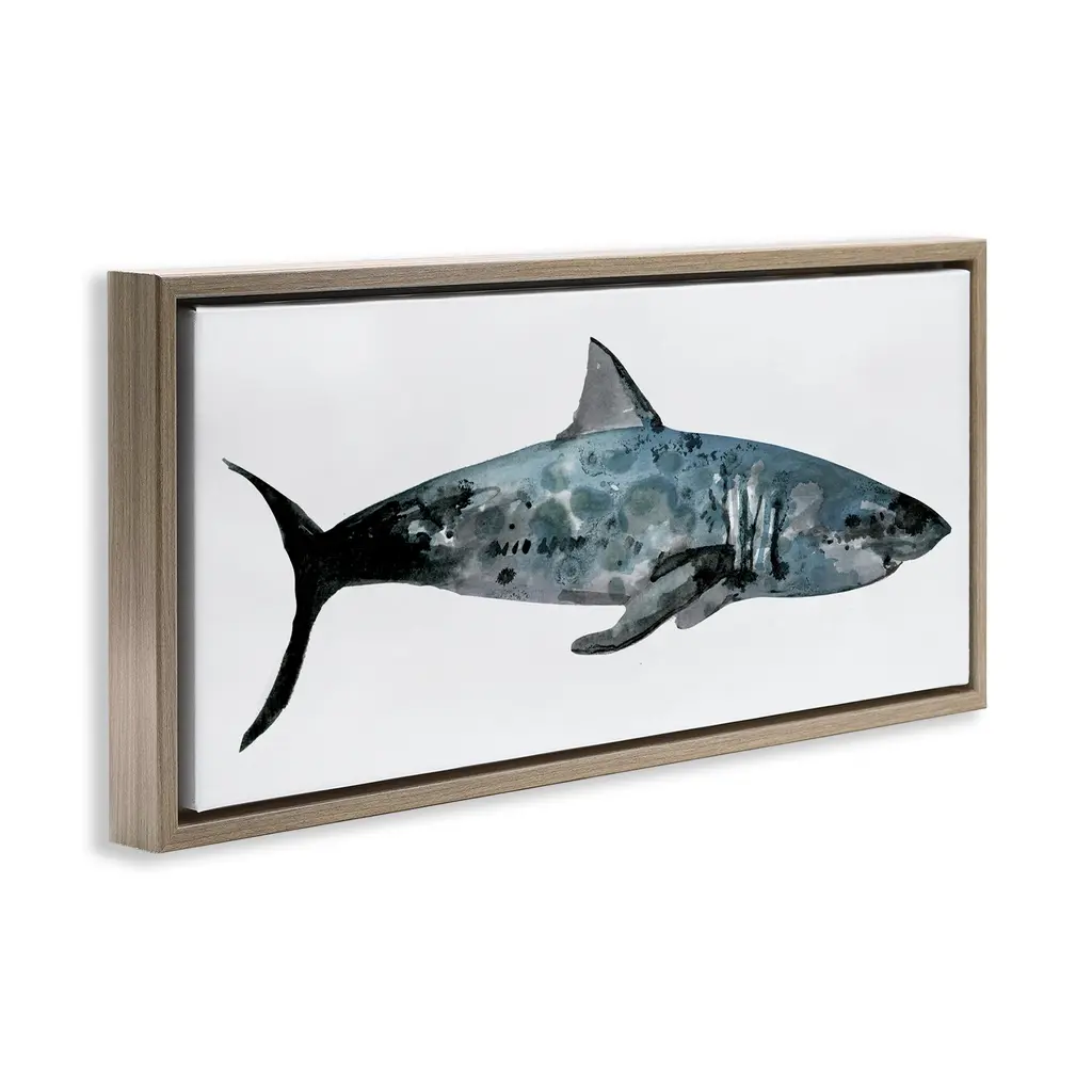 Elevate your home or office to the next level with Stupell Framed Floating Canvas Wall Art. Our premium hand-stretched canvas is mounted securely into a sturdy lightweight frame. The museum-style gap between the wrapped canvas and the box frame gives the illusion of floating artwork. Stupell Wall Art is made in the USA.Features: Dimensions: 25 x 1.7 x 11 Frame, 24 x 1.5 x 10 Canvas ArtFloating Frame Canvas Products are available in sizes 25"x11" and 31"x14". All Floating Frame Canvas Products have a 1.7" Depth.Wall Art is Ready to Hang with Hardware Free Hanging. No Installation required. For Easy Set Up Lean or Layer Artwork on Shelf or Against Wall. Artwork is Permently Fixed into the Frame.Our elevated 1.7" Thick Floating Frame is the perfect complement to our canvas style Wall Art. We use only the highest quality inks in house with industry leading printing solutions. Canvas is hand stretched over a durable wood foundation and then mounted securly into a Modern Box Frame. Made in the USA.Artwork Relates To: Nautical, Marine Life, Sea Life, Shark, AnimalDesign by Stellar Design Studio