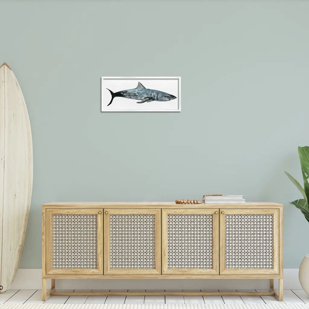 Add dimension to any room with our textured Framed Giclee Artwork. Our framed artwork is securely mounted into a 1.5-inch thick wood grain frame and ready to hang. Frames are available in three alluring styles: black, gray farmhouse and white. In addition, you should check out our oversized options if you want a statement piece. Stupell Wall Art is made in the USA.Features: Dimensions: 24 x 1.5 x 10 FramedFramed Giclee Product Sizes include 24"x10" and 30"x13". All Framed Giclee products have a 1.5" Depth.Wall Art is Ready to Hang with Hardware Free Hanging. No installation required. For Easy Set Up Lean or Layer Artwork on Shelf or Against Wall.Our giclée prints are carefully mounted on a durable MDF backing, and then perfectly finished in a 1.5 inch thick woodgrain frame. Mounted frame colors include black, gray farmhouse and white. Made In USA.Artwork Relates To: Nautical, Marine Life, Sea Life, Shark, AnimalDesign by Stellar Design Studio
