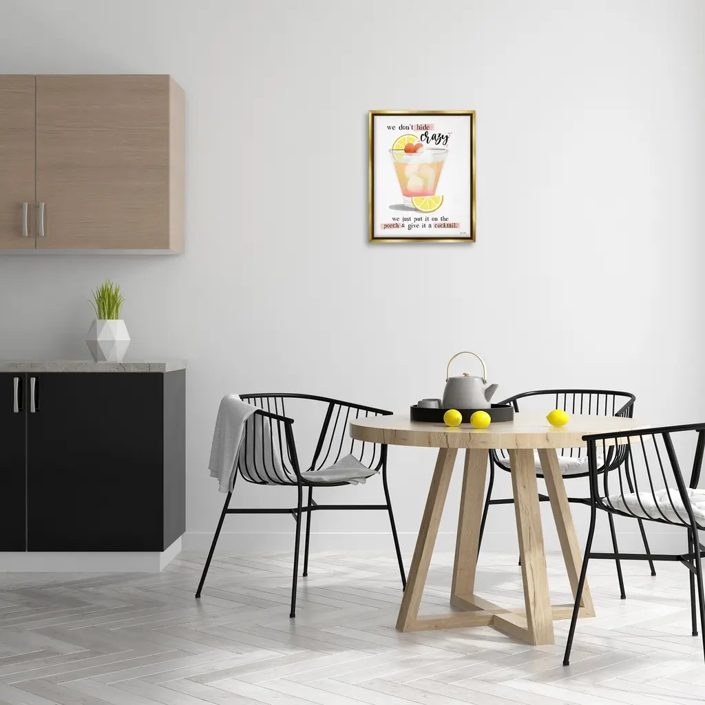 Elevate your home or office to the next level with Stupell Framed Floating Canvas Wall Art. Our premium hand-stretched canvas is mounted securely into a sturdy lightweight frame. The museum-style gap between the wrapped canvas and the box frame gives the illusion of floating artwork. Stupell Wall Art is made in the USA.Features: Dimensions: 17 x 1.7 x 21 Frame, 16 x 1.5 x 20 Canvas ArtFloating Frame Canvas Products are available in sizes 17"x21" and 25"x31". All Floating Frame Canvas Products have a 1.7" Depth.Wall Art is Ready to Hang with Hardware Free Hanging. No Installation required. For Easy Set Up Lean or Layer Artwork on Shelf or Against Wall. Artwork is Permently Fixed into the Frame.Our elevated 1.7" Thick Floating Frame is the perfect complement to our canvas style Wall Art. We use only the highest quality inks in house with industry leading printing solutions. Canvas is hand stretched over a durable wood foundation and then mounted securly into a Modern Box Frame. Made in the USA.Artwork Relates To: Beverage, Bar, Citrus, Fruit, Grapefruit, Alcohol, Cocktail, Mojito, Margarita, We Don't Hide Crazy we Just Put it on the Porch & Give it a CocktailDesign by House Fenway