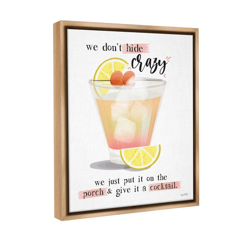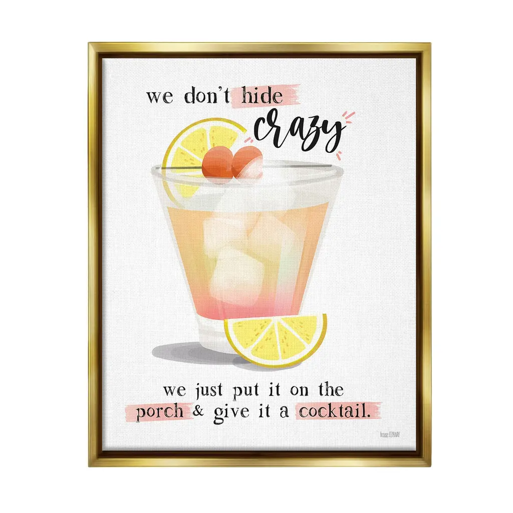Elevate your home or office to the next level with Stupell Framed Floating Canvas Wall Art. Our premium hand-stretched canvas is mounted securely into a sturdy lightweight frame. The museum-style gap between the wrapped canvas and the box frame gives the illusion of floating artwork. Stupell Wall Art is made in the USA.Features: Dimensions: 17 x 1.7 x 21 Frame, 16 x 1.5 x 20 Canvas ArtFloating Frame Canvas Products are available in sizes 17"x21" and 25"x31". All Floating Frame Canvas Products have a 1.7" Depth.Wall Art is Ready to Hang with Hardware Free Hanging. No Installation required. For Easy Set Up Lean or Layer Artwork on Shelf or Against Wall. Artwork is Permently Fixed into the Frame.Our elevated 1.7" Thick Floating Frame is the perfect complement to our canvas style Wall Art. We use only the highest quality inks in house with industry leading printing solutions. Canvas is hand stretched over a durable wood foundation and then mounted securly into a Modern Box Frame. Made in the USA.Artwork Relates To: Beverage, Bar, Citrus, Fruit, Grapefruit, Alcohol, Cocktail, Mojito, Margarita, We Don't Hide Crazy we Just Put it on the Porch & Give it a CocktailDesign by House Fenway