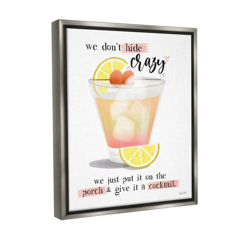 Elevate your home or office to the next level with Stupell Framed Floating Canvas Wall Art. Our premium hand-stretched canvas is mounted securely into a sturdy lightweight frame. The museum-style gap between the wrapped canvas and the box frame gives the illusion of floating artwork. Stupell Wall Art is made in the USA.Features: Dimensions: 17 x 1.7 x 21 Frame, 16 x 1.5 x 20 Canvas ArtFloating Frame Canvas Products are available in sizes 17"x21" and 25"x31". All Floating Frame Canvas Products have a 1.7" Depth.Wall Art is Ready to Hang with Hardware Free Hanging. No Installation required. For Easy Set Up Lean or Layer Artwork on Shelf or Against Wall. Artwork is Permently Fixed into the Frame.Our elevated 1.7" Thick Floating Frame is the perfect complement to our canvas style Wall Art. We use only the highest quality inks in house with industry leading printing solutions. Canvas is hand stretched over a durable wood foundation and then mounted securly into a Modern Box Frame. Made in the USA.Artwork Relates To: Beverage, Bar, Citrus, Fruit, Grapefruit, Alcohol, Cocktail, Mojito, Margarita, We Don't Hide Crazy we Just Put it on the Porch & Give it a CocktailDesign by House Fenway
