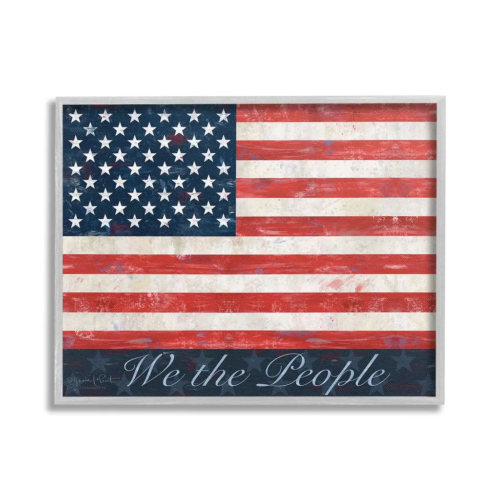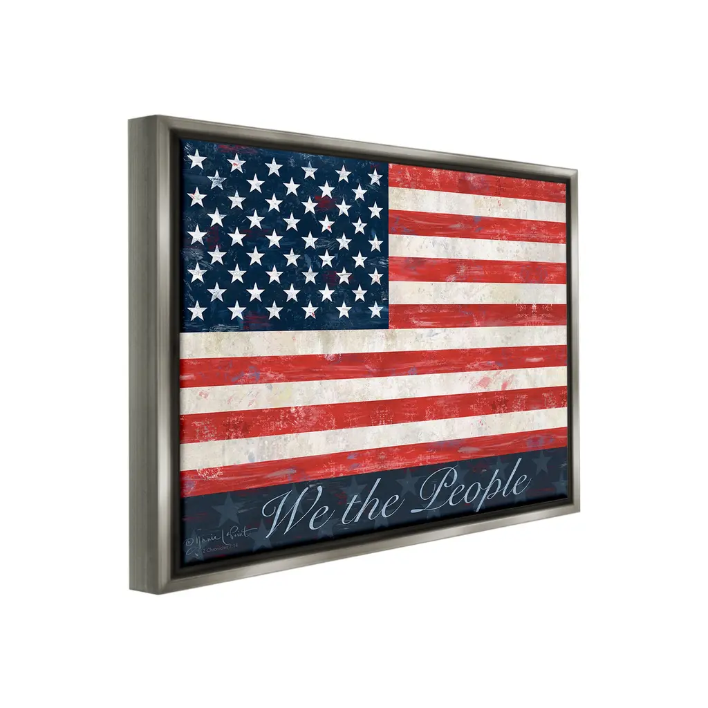 Elevate your home or office to the next level with Stupell Framed Floating Canvas Wall Art. Our premium hand-stretched canvas is mounted securely into a sturdy lightweight frame. The museum-style gap between the wrapped canvas and the box frame gives the illusion of floating artwork. Stupell Wall Art is made in the USA.Features: Dimensions: 21 x 1.7 x 17 Frame, 20 x 1.5 x 16 Canvas ArtFloating Frame Canvas Products are available in sizes 21"x17" and 31"x25". All Floating Frame Canvas Products have a 1.7" Depth.Wall Art is Ready to Hang with Hardware Free Hanging. No Installation required. For Easy Set Up Lean or Layer Artwork on Shelf or Against Wall. Artwork is Permently Fixed into the Frame.Our elevated 1.7" Thick Floating Frame is the perfect complement to our canvas style Wall Art. We use only the highest quality inks in house with industry leading printing solutions. Canvas is hand stretched over a durable wood foundation and then mounted securly into a Modern Box Frame. Made in the USA.Artwork Relates To: American Flag, Flag, Americana, Patriotic, Rustic, Country, Farmhouse, We the PeopleDesign by Annie LaPoint