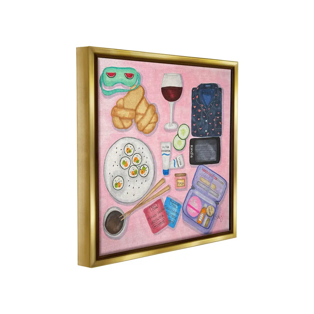 Elevate your home or office to the next level with Stupell Framed Floating Canvas Wall Art. Our premium hand-stretched canvas is mounted securely into a sturdy lightweight frame. The museum-style gap between the wrapped canvas and the box frame gives the illusion of floating artwork. Stupell Wall Art is made in the USA.Features: Dimensions: 18 x 1.7 x 18 Frame, 17 x 1.5 x 17 Canvas ArtFloating Frame Canvas Products are available in sizes 18"x18" and 25"x25". All Floating Frame Canvas Products have a 1.7" Depth.Wall Art is Ready to Hang with Hardware Free Hanging. No Installation required. For Easy Set Up Lean or Layer Artwork on Shelf or Against Wall. Artwork is Permently Fixed into the Frame.Our elevated 1.7" Thick Floating Frame is the perfect complement to our canvas style Wall Art. We use only the highest quality inks in house with industry leading printing solutions. Canvas is hand stretched over a durable wood foundation and then mounted securly into a Modern Box Frame. Made in the USA.Artwork Relates To: Food, Lunch, Meal, Wine, Cosmetics, Makeup, Slippers, Sushi, Beauty, Night, WeekendDesign by Ale Saiz Studio