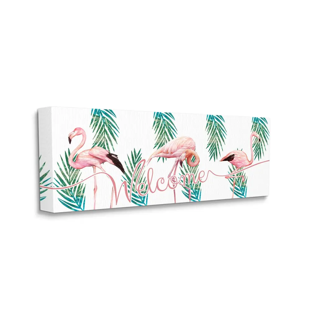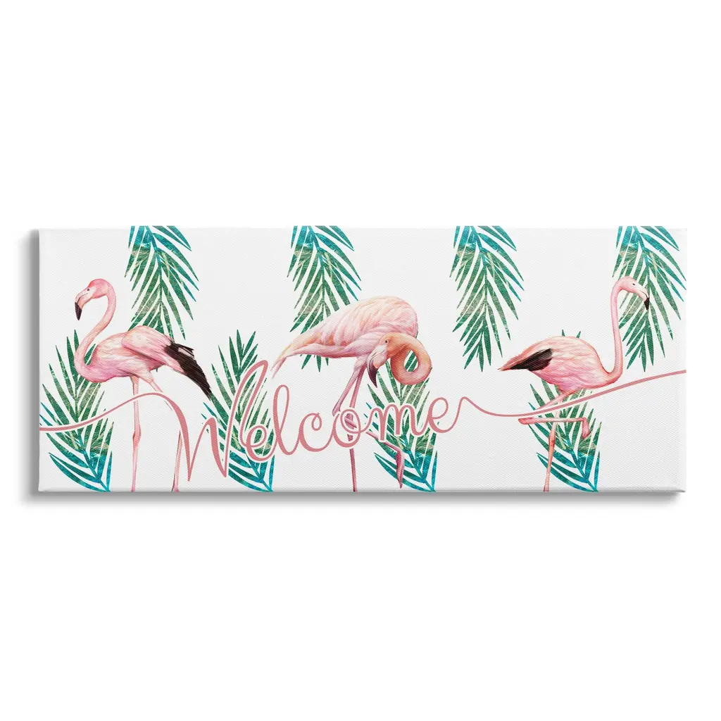 Stupell Welcome Greeting Pink Flamingo Trio Tropical Palm Fronds Canvas Wall Art - 24 X 10