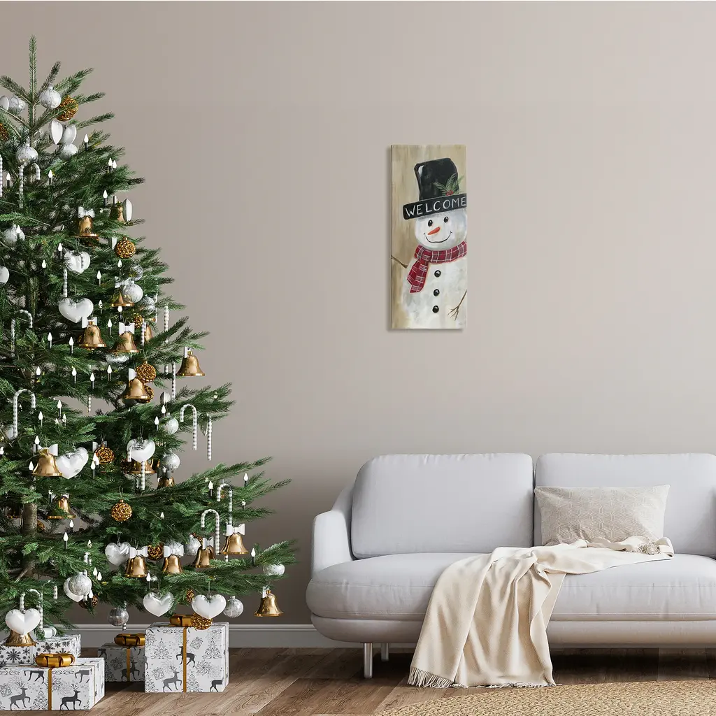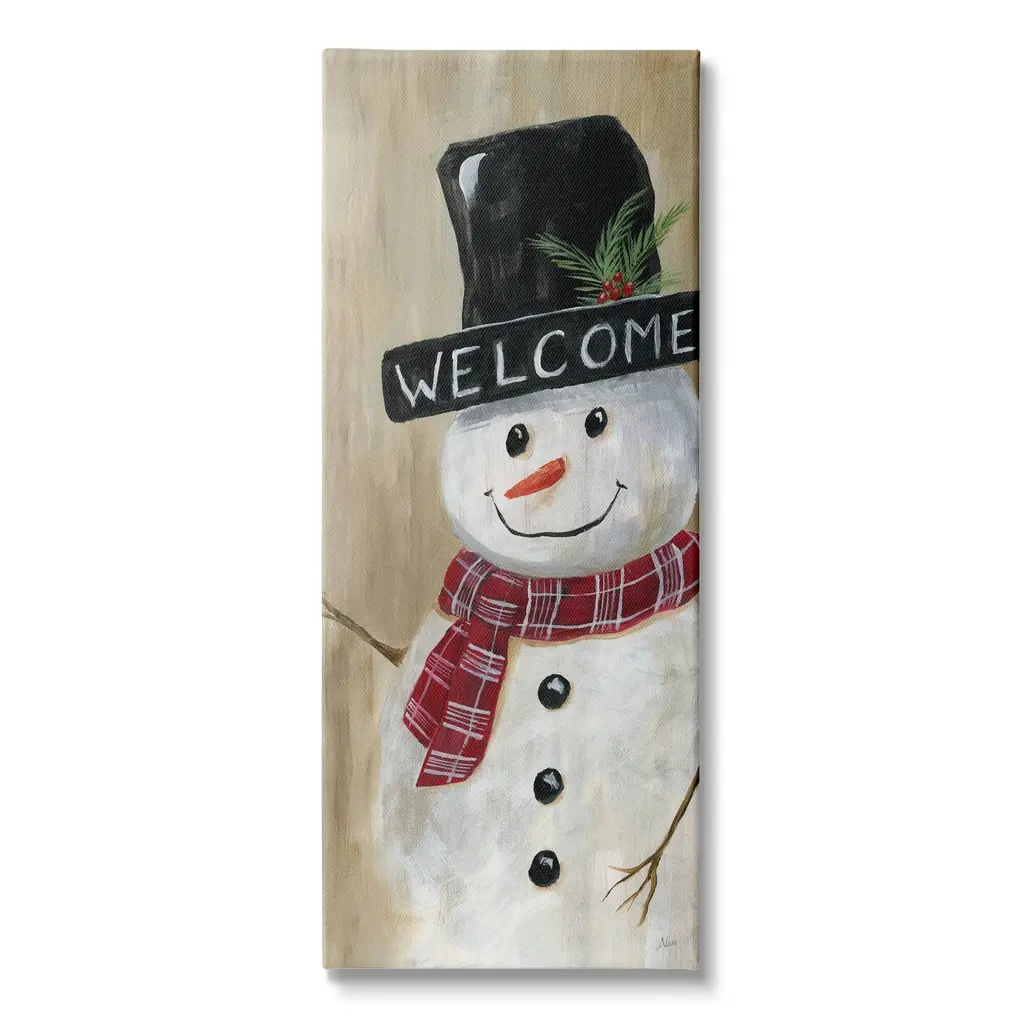 Stupell Welcome Greeting Rustic Winter Snowman Festive Holly Hat Canvas Wall Art - White - 17 X 40