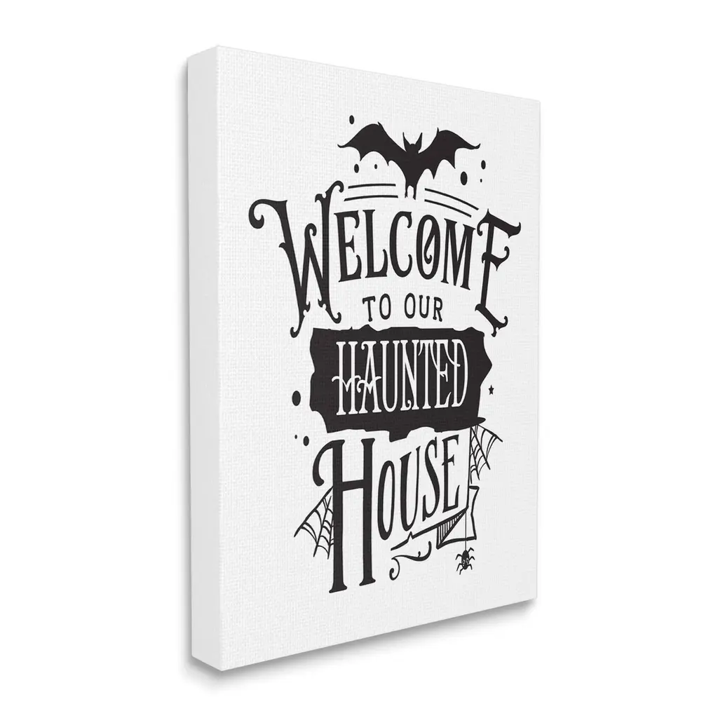 Stupell Welcome Haunted House Halloween Bat Spider Webs Canvas Wall Art - White - 16 X 20