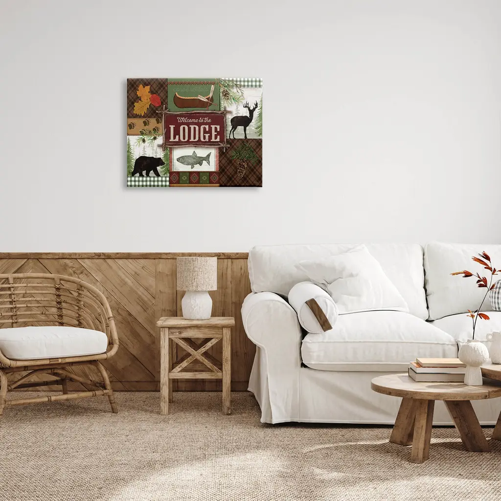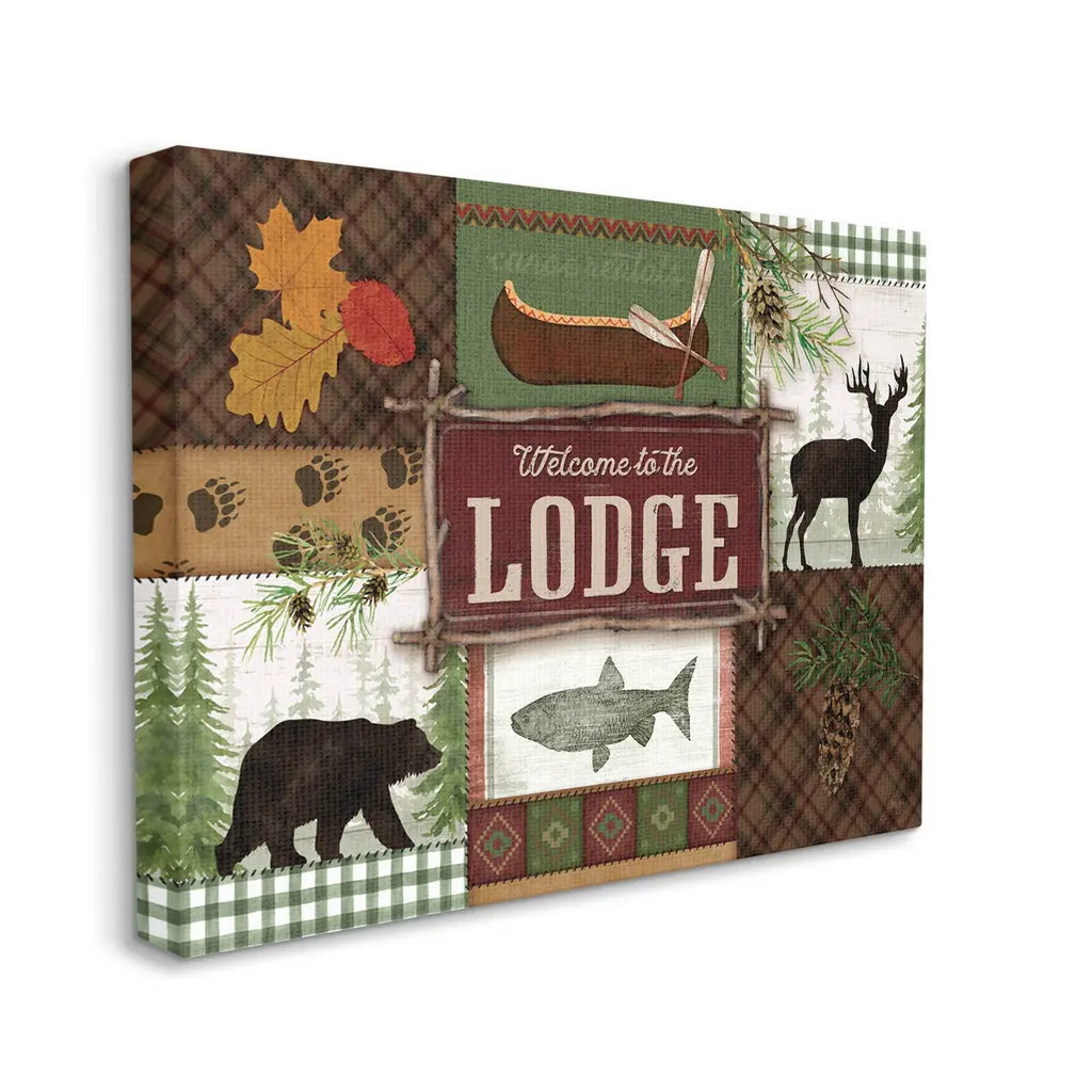 Proudly made in the USA, Our stretched canvas is created with the highest standards. We use only the highest quality inks and canvas on our in house Mimaki printers, and then hand cut and stretch each piece over a 1.5 inch thick wooden frame for hanging. The art comes ready to hang with no installation required.Features: Dimensions: 20 x 1.5 x 16 InchesStretched Canvas Sizes Include Standard: 20 x 1.5 x 16 Large: 30 x 1.5 x 20 X-Large: 40 x 1.5 x 30 Oversized: 48 x 1.5 x 36Wall Art is Ready to Hang - No Installation or Hardware Needed. For Easy Set Up Lean or Layer Artwork on Shelf or Against Wall.Our stretched canvas is created with the highest standards. We use only the highest quality inks and canvas on our in house Mimaki printers, and then hand cut and stretch each piece over a 1.5 inch thick wooden frame for hanging. Made In USA.Artwork Relates To: Leaf, Plant, Bear, Wildlife, Animal, Mammal, Deer, Tree, Elk, Black Bear, Silhouette, Lodge, Cabin, Foliage, Canoe, Fish, Pattern, Tartan, PlaidDesign by Mollie B.First perfectly in any Living Room, Den, Hallway, Office, Entryway, Study, Dining Room or Bed Room.Text Includes: Welcome To The Lodge