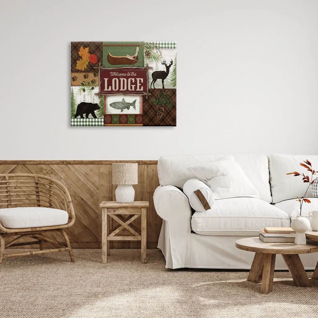 Proudly made in the USA, Our stretched canvas is created with the highest standards. We use only the highest quality inks and canvas on our in house Mimaki printers, and then hand cut and stretch each piece over a 1.5 inch thick wooden frame for hanging. The art comes ready to hang with no installation required.Features: Dimensions: 20 x 1.5 x 16 InchesStretched Canvas Sizes Include Standard: 20 x 1.5 x 16 Large: 30 x 1.5 x 20 X-Large: 40 x 1.5 x 30 Oversized: 48 x 1.5 x 36Wall Art is Ready to Hang - No Installation or Hardware Needed. For Easy Set Up Lean or Layer Artwork on Shelf or Against Wall.Our stretched canvas is created with the highest standards. We use only the highest quality inks and canvas on our in house Mimaki printers, and then hand cut and stretch each piece over a 1.5 inch thick wooden frame for hanging. Made In USA.Artwork Relates To: Leaf, Plant, Bear, Wildlife, Animal, Mammal, Deer, Tree, Elk, Black Bear, Silhouette, Lodge, Cabin, Foliage, Canoe, Fish, Pattern, Tartan, PlaidDesign by Mollie B.First perfectly in any Living Room, Den, Hallway, Office, Entryway, Study, Dining Room or Bed Room.Text Includes: Welcome To The Lodge