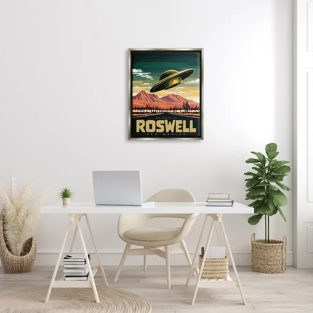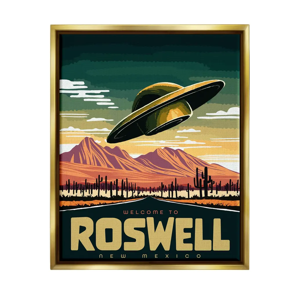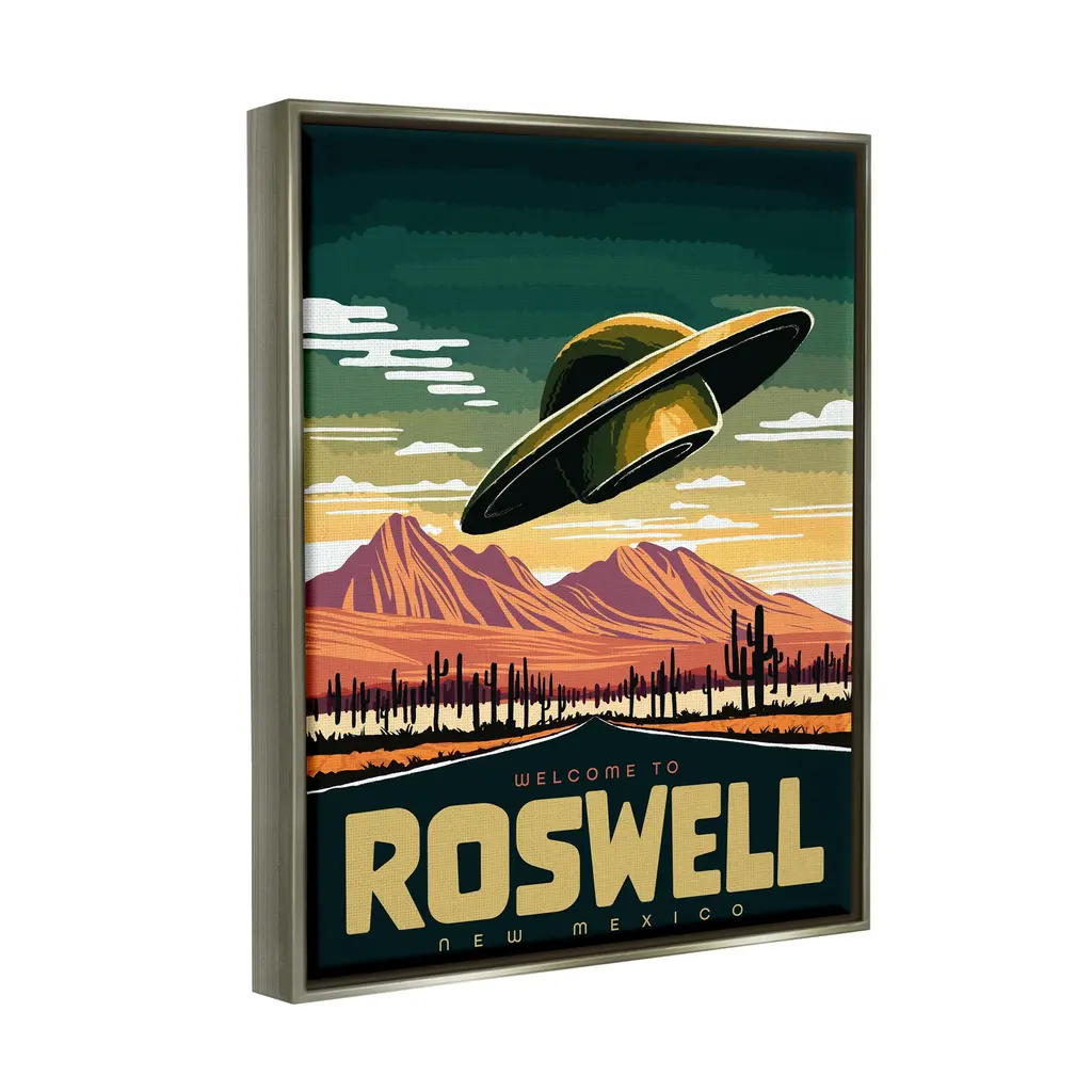 Elevate your home or office to the next level with Stupell Framed Floating Canvas Wall Art. Our premium hand-stretched canvas is mounted securely into a sturdy lightweight frame. The museum-style gap between the wrapped canvas and the box frame gives the illusion of floating artwork. Stupell Wall Art is made in the USA.Features: Dimensions: 17 x 1.7 x 21 Frame, 16 x 1.5 x 20 Canvas ArtFloating Frame Sizes Include Standard: 17 x 1.7 x 21 Oversized: 25 x 1.7 x 31Wall Art is Ready to Hang - No Installation or Hardware Needed. For Easy Set Up Lean or Layer Artwork on Shelf or Against Wall.Our elevated 1.7" Thick Floating Frame is the perfect complement to our canvas style Wall Art. We use only the highest quality inks in house with industry leading printing solutions. Canvas is hand stretched over a durable wood foundation and then mounted securly into a Modern Box Frame. Made in the USA.Artwork Relates To: UFO, Desert, Cactus, Landscape, Welcome To Roswell New MexicoDesign by Ziwei Li