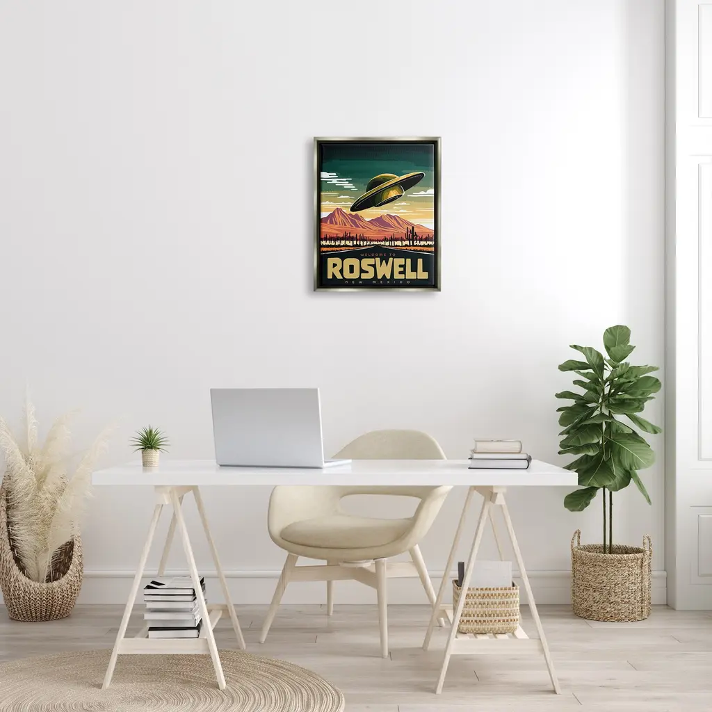 Elevate your home or office to the next level with Stupell Framed Floating Canvas Wall Art. Our premium hand-stretched canvas is mounted securely into a sturdy lightweight frame. The museum-style gap between the wrapped canvas and the box frame gives the illusion of floating artwork. Stupell Wall Art is made in the USA.Features: Dimensions: 17 x 1.7 x 21 Frame, 16 x 1.5 x 20 Canvas ArtFloating Frame Sizes Include Standard: 17 x 1.7 x 21 Oversized: 25 x 1.7 x 31Wall Art is Ready to Hang - No Installation or Hardware Needed. For Easy Set Up Lean or Layer Artwork on Shelf or Against Wall.Our elevated 1.7" Thick Floating Frame is the perfect complement to our canvas style Wall Art. We use only the highest quality inks in house with industry leading printing solutions. Canvas is hand stretched over a durable wood foundation and then mounted securly into a Modern Box Frame. Made in the USA.Artwork Relates To: UFO, Desert, Cactus, Landscape, Welcome To Roswell New MexicoDesign by Ziwei Li