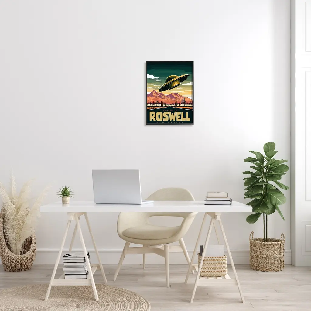 Add dimension to any room with our textured Framed Giclee Artwork. Our framed artwork is securely mounted into a 1.5-inch thick wood grain frame and ready to hang. Frames are available in three alluring styles: black, gray farmhouse and white. In addition, you should check out our oversized options if you want a statement piece. Stupell Wall Art is made in the USA.Features: Dimensions: 11 x 1.5 x 14 FramedFramed Giclee Sizes Include Standard: 11 x 1.5 x 14 Large: 16 x 1.5 x 20 Oversized: 24 x 1.5 x 30Wall Art is Ready to Hang - No Installation or Hardware Needed. For Easy Set Up Lean or Layer Artwork on Shelf or Against Wall.Our giclée prints are carefully mounted on a durable MDF backing, and then perfectly finished in a 1.5 inch thick woodgrain frame. Mounted frame colors include black, gray farmhouse and white. Made In USA.Artwork Relates To: UFO, Desert, Cactus, Landscape, Welcome To Roswell New MexicoDesign by Ziwei Li