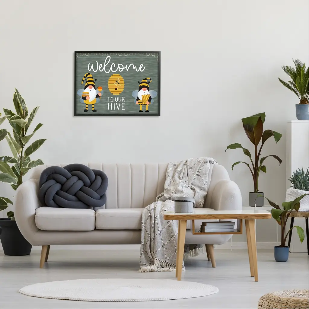 Stupell Welcome To Our Hive Honey Bee Garden Gnomes Typography Framed Wall Art - Grey - 30 X 24 - Black