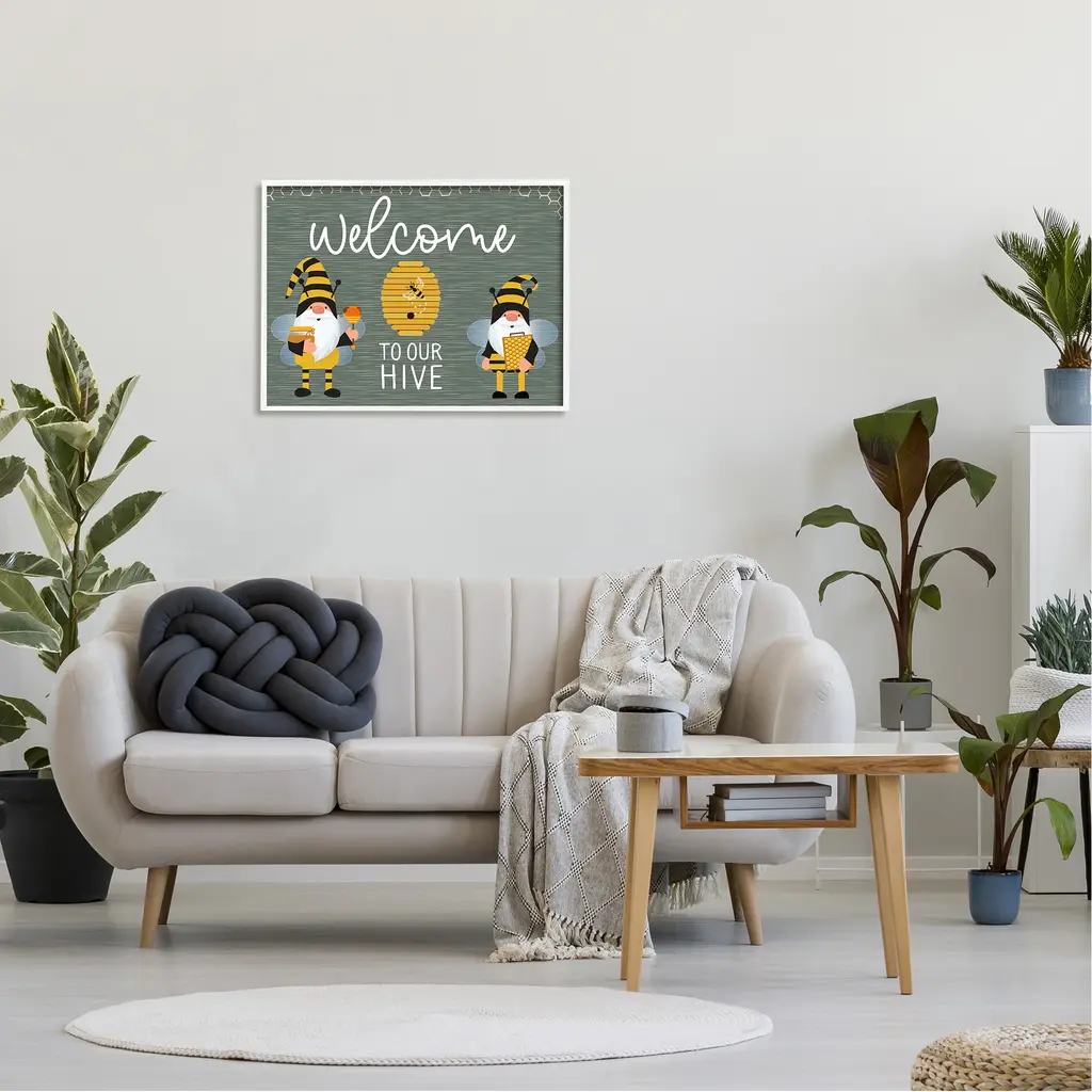 Stupell Welcome To Our Hive Honey Bee Garden Gnomes Typography Framed Wall Art - Grey - 30 X 24 - White