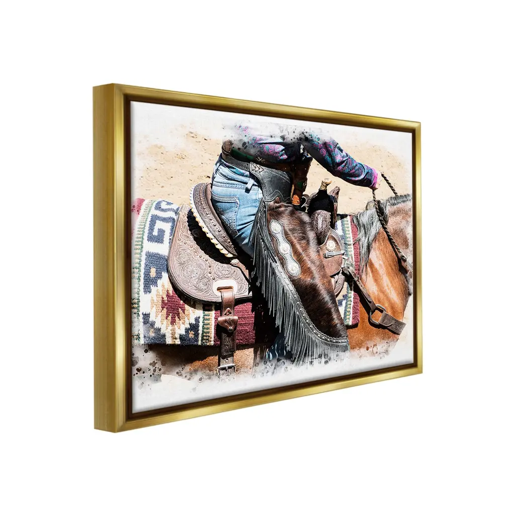 Elevate your home or office to the next level with Stupell Framed Floating Canvas Wall Art. Our premium hand-stretched canvas is mounted securely into a sturdy lightweight frame. The museum-style gap between the wrapped canvas and the box frame gives the illusion of floating artwork. Stupell Wall Art is made in the USA.Features: Dimensions: 21 x 1.7 x 17 Frame, 20 x 1.5 x 16 Canvas ArtFloating Frame Canvas Products are available in sizes 21"x17" and 31"x25". All Floating Frame Canvas Products have a 1.7" Depth.Wall Art is Ready to Hang with Hardware Free Hanging. No Installation required. For Easy Set Up Lean or Layer Artwork on Shelf or Against Wall. Artwork is Permently Fixed into the Frame.Our elevated 1.7" Thick Floating Frame is the perfect complement to our canvas style Wall Art. We use only the highest quality inks in house with industry leading printing solutions. Canvas is hand stretched over a durable wood foundation and then mounted securly into a Modern Box Frame. Made in the USA.Artwork Relates To: Animal, Horse, Mammal, Saddle, Equestrian, Person, Rodeo, Country, Southwestern, CowboyDesign by Jerry Cowart
