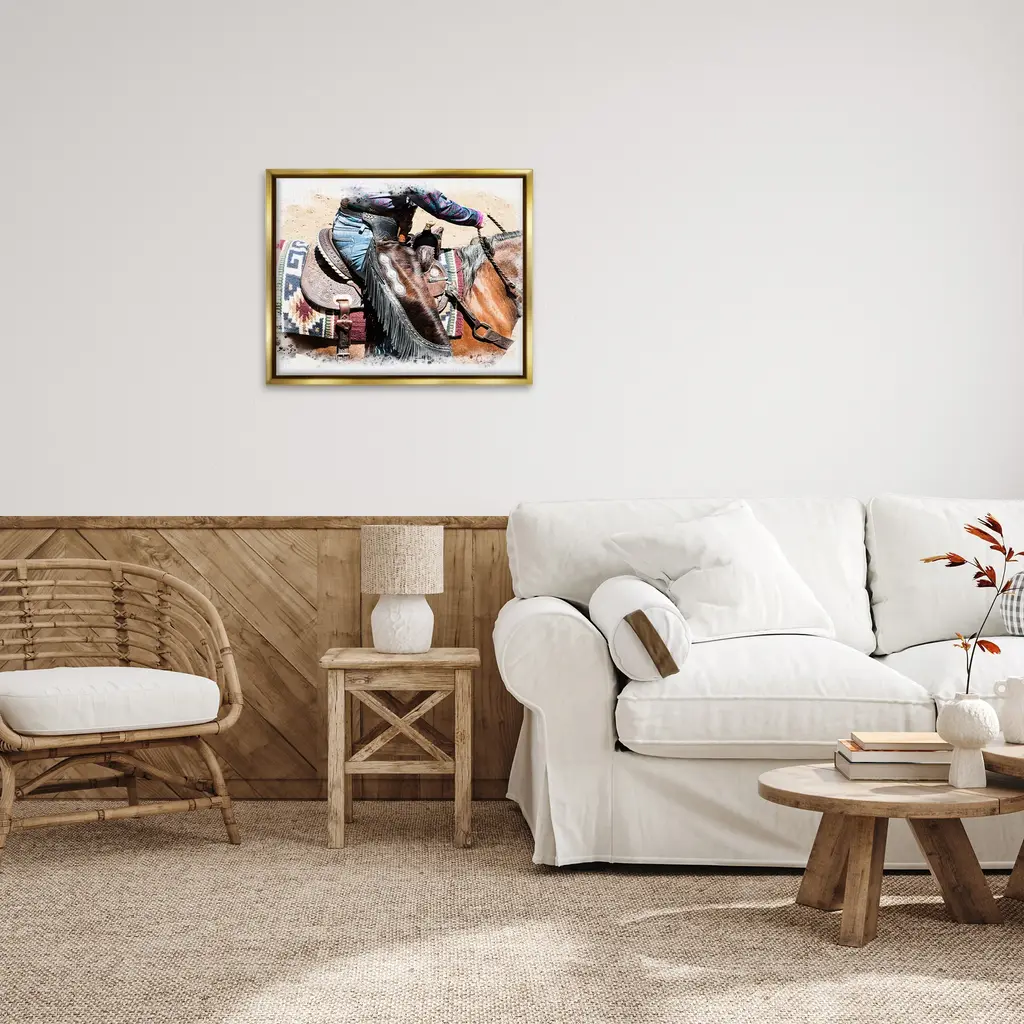 Elevate your home or office to the next level with Stupell Framed Floating Canvas Wall Art. Our premium hand-stretched canvas is mounted securely into a sturdy lightweight frame. The museum-style gap between the wrapped canvas and the box frame gives the illusion of floating artwork. Stupell Wall Art is made in the USA.Features: Dimensions: 21 x 1.7 x 17 Frame, 20 x 1.5 x 16 Canvas ArtFloating Frame Canvas Products are available in sizes 21"x17" and 31"x25". All Floating Frame Canvas Products have a 1.7" Depth.Wall Art is Ready to Hang with Hardware Free Hanging. No Installation required. For Easy Set Up Lean or Layer Artwork on Shelf or Against Wall. Artwork is Permently Fixed into the Frame.Our elevated 1.7" Thick Floating Frame is the perfect complement to our canvas style Wall Art. We use only the highest quality inks in house with industry leading printing solutions. Canvas is hand stretched over a durable wood foundation and then mounted securly into a Modern Box Frame. Made in the USA.Artwork Relates To: Animal, Horse, Mammal, Saddle, Equestrian, Person, Rodeo, Country, Southwestern, CowboyDesign by Jerry Cowart