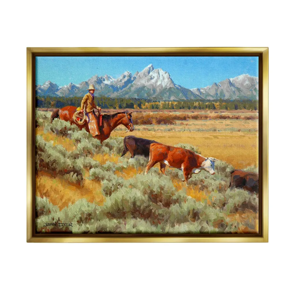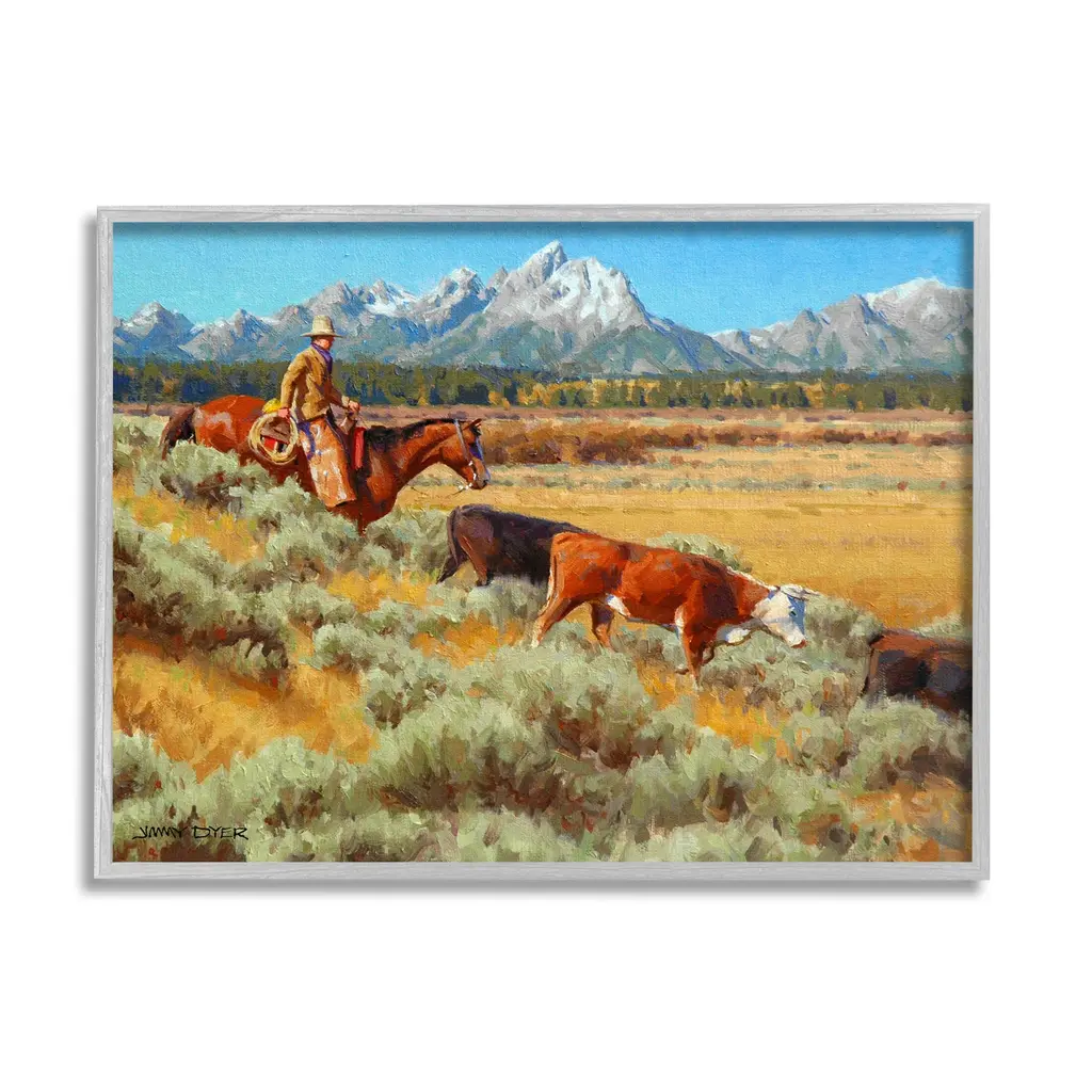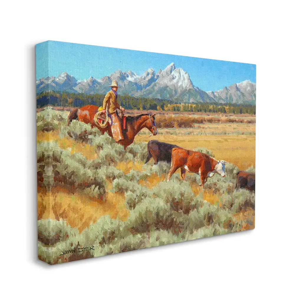 Proudly made in the USA, Our stretched canvas is created with the highest standards. We use only the highest quality inks and canvas on our in house Mimaki printers, and then hand cut and stretch each piece over a 1.5 inch thick wooden frame for hanging. The art comes ready to hang with no installation required.Features: Dimensions: 20 x 1.5 x 16 InchesStretched Canvas Sizes Include Standard: 20 x 1.5 x 16 Large: 30 x 1.5 x 20 X-Large: 40 x 1.5 x 30 Oversized: 48 x 1.5 x 36Wall Art is Ready to Hang - No Installation or Hardware Needed. For Easy Set Up Lean or Layer Artwork on Shelf or Against Wall.Our stretched canvas is created with the highest standards. We use only the highest quality inks and canvas on our in house Mimaki printers, and then hand cut and stretch each piece over a 1.5 inch thick wooden frame for hanging. Made In USA.Artwork Relates To: Person, Cow, Mammal, Animal, Cattle, Nature, Ranch, Countryside, Farm, Rural, Horse, Grassland, Field, PastureDesign by Jimmy Dyer