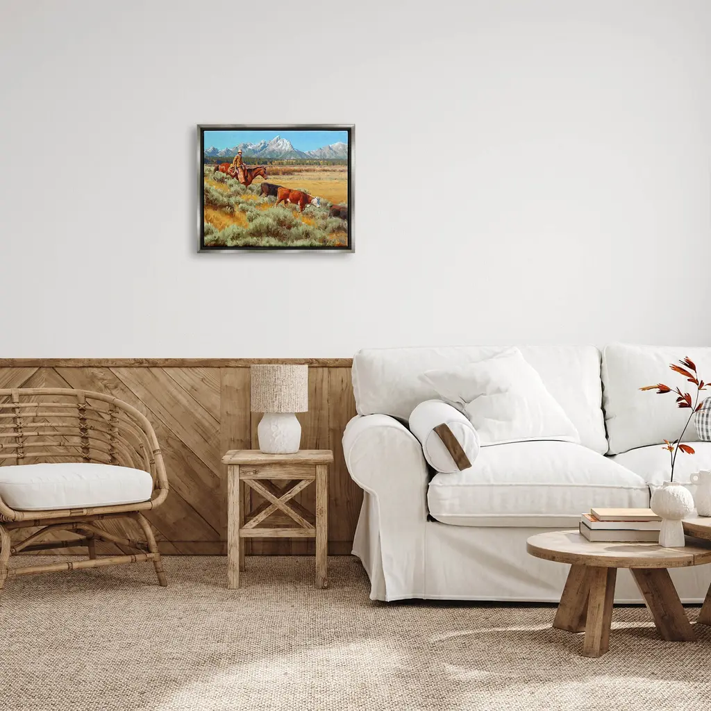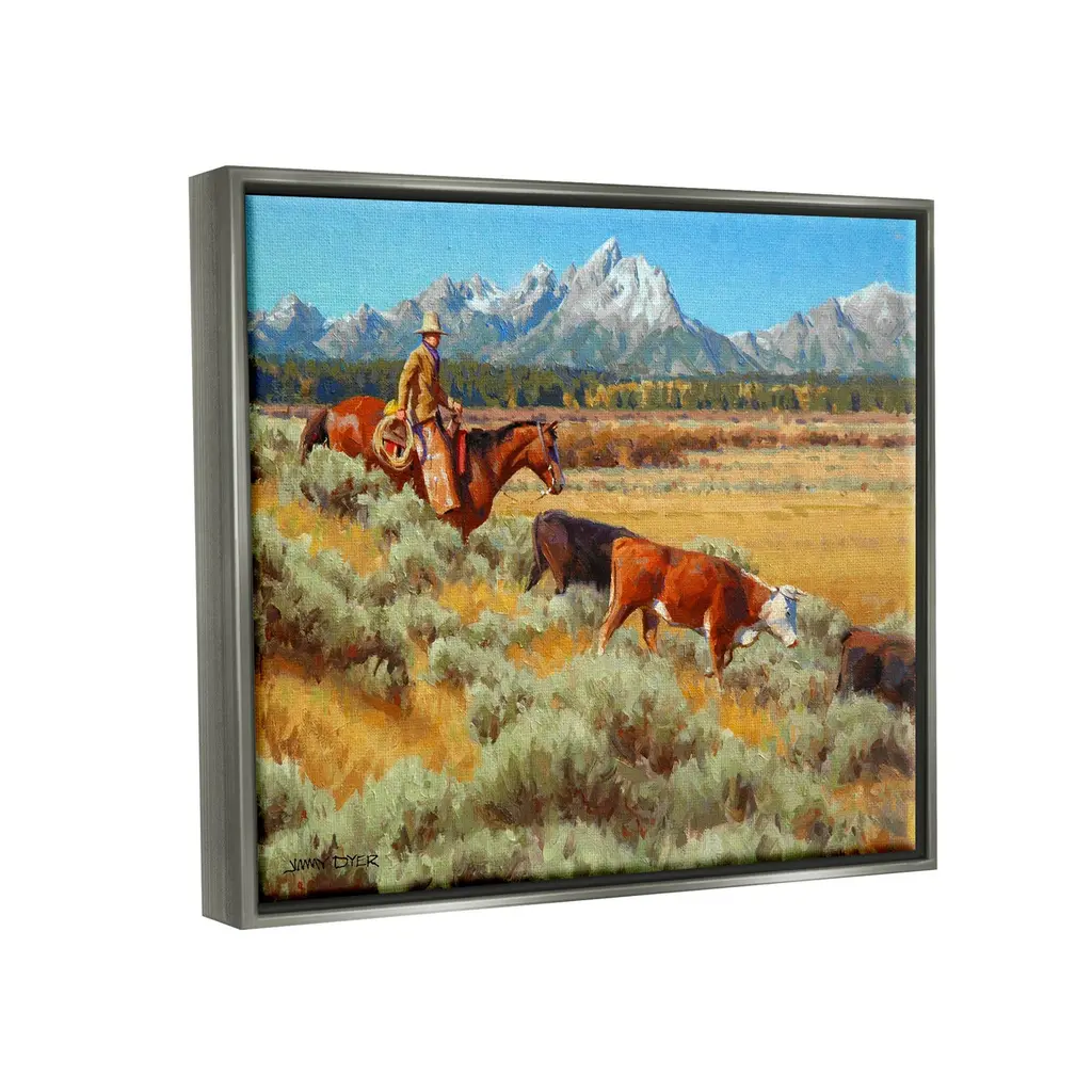 Elevate your home or office to the next level with Stupell Framed Floating Canvas Wall Art. Our premium hand stretched canvas is mounted securly into a sturdy lightweight frame. The museum style gap between wrapped canvas and box frame gives the illusion of floating artwork. Features: Dimensions: 21 x 1.7 x 17 Frame, 20 x 1.5 x 16 Canvas ArtFloating Frame Sizes Include Standard: 21 x 1.7 x 17 Oversized: 31 x 1.7 x 25Wall Art is Ready to Hang - No Installation or Hardware Needed. For Easy Set Up Lean or Layer Artwork on Shelf or Against Wall.Our elevated 1.7" Thick Floating Frame is the perfect complement to our canvas style Wall Art. We use only the highest quality inks in house with industry leading printing solutions. Canvas is hand stretched over a durable wood foundation and then mounted securly into a Modern Box Frame. Made in the USA.Artwork Relates To: Person, Cow, Mammal, Animal, Cattle, Nature, Ranch, Countryside, Farm, Rural, Horse, Grassland, Field, PastureDesign by Jimmy Dyer