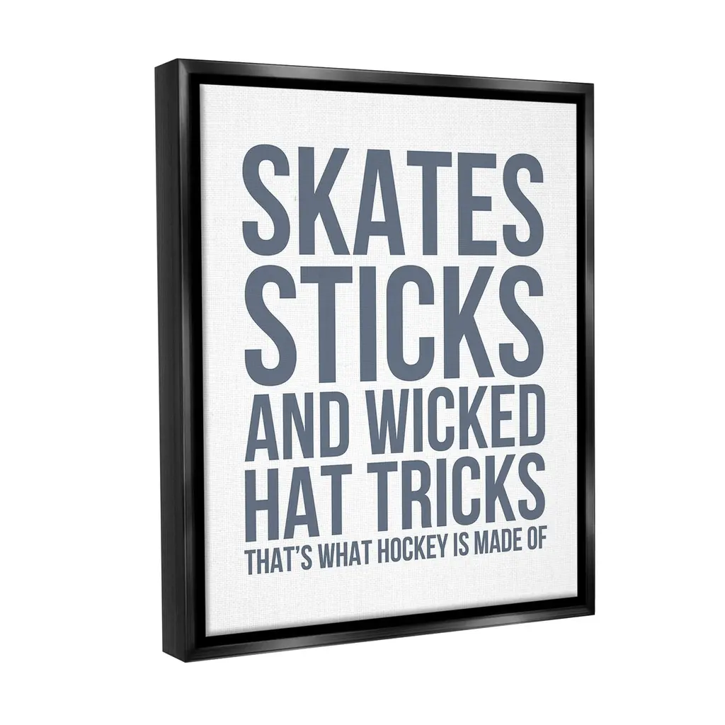 Elevate your home or office to the next level with Stupell Framed Floating Canvas Wall Art. Our premium hand-stretched canvas is mounted securely into a sturdy lightweight frame. The museum-style gap between the wrapped canvas and the box frame gives the illusion of floating artwork. Stupell Wall Art is made in the USA.Features: Dimensions: 17 x 1.7 x 21 Frame, 16 x 1.5 x 20 Canvas ArtFloating Frame Canvas Products are available in sizes 17"x21" and 25"x31". All Floating Frame Canvas Products have a 1.7" Depth.Wall Art is Ready to Hang with Hardware Free Hanging. No Installation required. For Easy Set Up Lean or Layer Artwork on Shelf or Against Wall. Artwork is Permently Fixed into the Frame.Our elevated 1.7" Thick Floating Frame is the perfect complement to our canvas style Wall Art. We use only the highest quality inks in house with industry leading printing solutions. Canvas is hand stretched over a durable wood foundation and then mounted securly into a Modern Box Frame. Made in the USA.Artwork Relates To: Hockey, Sport, Ice Hockey, Phrase, Minimal, Skates Sticks and Wicked Hat Tricks, That's What Hockey is Made OfDesign by Leah Straatsma
