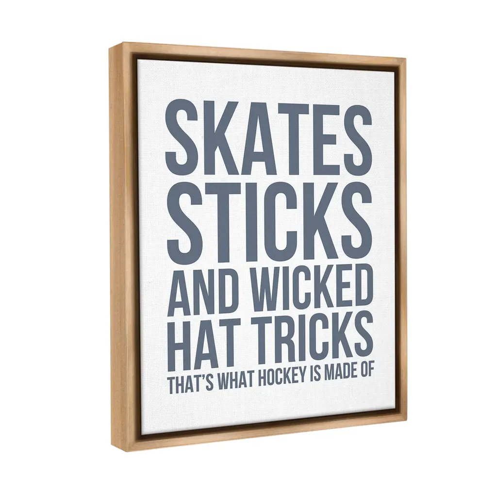 Elevate your home or office to the next level with Stupell Framed Floating Canvas Wall Art. Our premium hand-stretched canvas is mounted securely into a sturdy lightweight frame. The museum-style gap between the wrapped canvas and the box frame gives the illusion of floating artwork. Stupell Wall Art is made in the USA.Features: Dimensions: 17 x 1.7 x 21 Frame, 16 x 1.5 x 20 Canvas ArtFloating Frame Canvas Products are available in sizes 17"x21" and 25"x31". All Floating Frame Canvas Products have a 1.7" Depth.Wall Art is Ready to Hang with Hardware Free Hanging. No Installation required. For Easy Set Up Lean or Layer Artwork on Shelf or Against Wall. Artwork is Permently Fixed into the Frame.Our elevated 1.7" Thick Floating Frame is the perfect complement to our canvas style Wall Art. We use only the highest quality inks in house with industry leading printing solutions. Canvas is hand stretched over a durable wood foundation and then mounted securly into a Modern Box Frame. Made in the USA.Artwork Relates To: Hockey, Sport, Ice Hockey, Phrase, Minimal, Skates Sticks and Wicked Hat Tricks, That's What Hockey is Made OfDesign by Leah Straatsma
