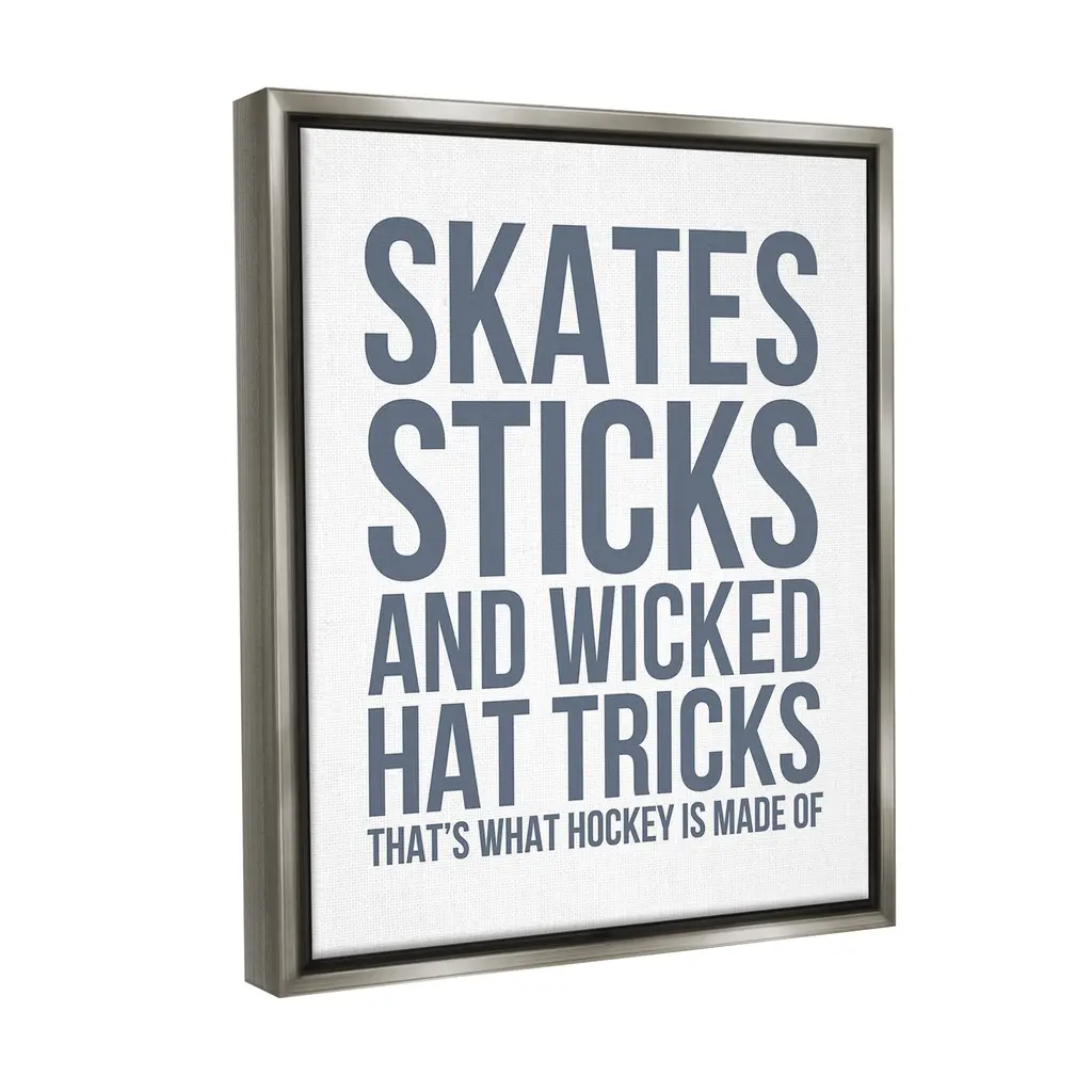 Elevate your home or office to the next level with Stupell Framed Floating Canvas Wall Art. Our premium hand-stretched canvas is mounted securely into a sturdy lightweight frame. The museum-style gap between the wrapped canvas and the box frame gives the illusion of floating artwork. Stupell Wall Art is made in the USA.Features: Dimensions: 17 x 1.7 x 21 Frame, 16 x 1.5 x 20 Canvas ArtFloating Frame Canvas Products are available in sizes 17"x21" and 25"x31". All Floating Frame Canvas Products have a 1.7" Depth.Wall Art is Ready to Hang with Hardware Free Hanging. No Installation required. For Easy Set Up Lean or Layer Artwork on Shelf or Against Wall. Artwork is Permently Fixed into the Frame.Our elevated 1.7" Thick Floating Frame is the perfect complement to our canvas style Wall Art. We use only the highest quality inks in house with industry leading printing solutions. Canvas is hand stretched over a durable wood foundation and then mounted securly into a Modern Box Frame. Made in the USA.Artwork Relates To: Hockey, Sport, Ice Hockey, Phrase, Minimal, Skates Sticks and Wicked Hat Tricks, That's What Hockey is Made OfDesign by Leah Straatsma