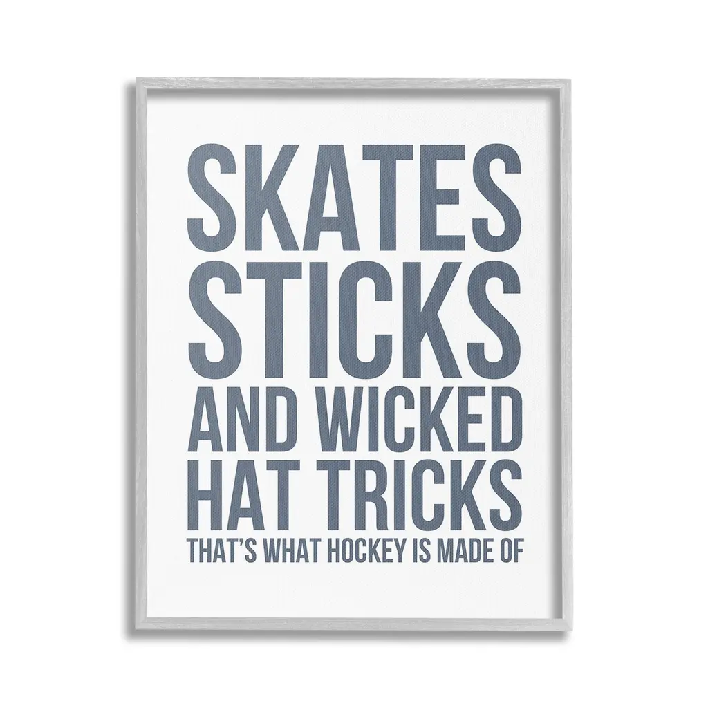 Add dimension to any room with our textured Framed Giclee Artwork. Our framed artwork is securely mounted into a 1.5-inch thick wood grain frame and ready to hang. Frames are available in three alluring styles: black, gray farmhouse and white. In addition, you should check out our oversized options if you want a statement piece. Stupell Wall Art is made in the USA.Features: Dimensions: 11 x 1.5 x 14 FramedFramed Giclee Products are available in the sizes 11"x14", 16"x20" or 24"x30". All Framed Giclee Products have a 1.5" Depth. Wall Art is Ready to Hang with Hardware Free Hanging. No installation required. For Easy Set Up Lean or Layer Artwork on Shelf or Against Wall.Our giclée prints are carefully mounted on a durable MDF backing, and then perfectly finished in a 1.5 inch thick woodgrain frame. Mounted frame colors include black, gray farmhouse and white. Made In USA.Artwork Relates To: Hockey, Sport, Ice Hockey, Phrase, Minimal, Skates Sticks and Wicked Hat Tricks, That's What Hockey is Made OfDesign by Leah Straatsma
