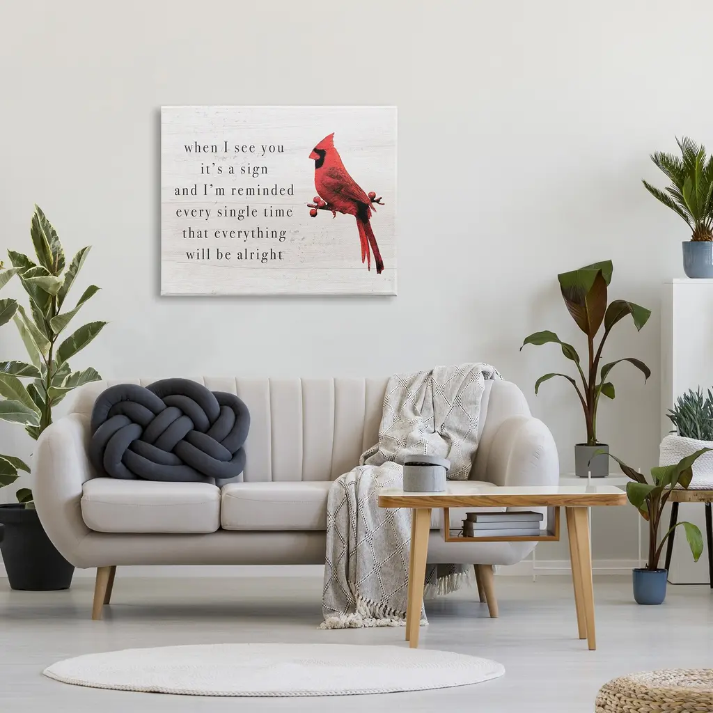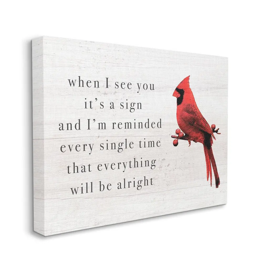 We create our stretched canvas to the highest standards. Using only the highest quality inks and canvas on Mimaki printers, we hand-cut and stretch each piece over a 1.5-inch thick wooden frame for hanging. As a result, the art comes ready to hang on the sturdy ledge with no installation required. Stupell Wall Art is made in the USA.Features: Dimensions: 20 x 1.5 x 16 InchesStretched Canvas Sizes Include Standard: 20 x 1.5 x 16 Large: 30 x 1.5 x 20 X-Large: 40 x 1.5 x 30 Oversized: 48 x 1.5 x 36Wall Art is Ready to Hang - No Installation or Hardware Needed. For Easy Set Up Lean or Layer Artwork on Shelf or Against Wall.Our stretched canvas is created with the highest standards. We use only the highest quality inks and canvas on our in house Mimaki printers, and then hand cut and stretch each piece over a 1.5 inch thick wooden frame for hanging. Made In USA.Artwork Relates To: Animal, Bird, Cardinal, Phrase, When I See You it's a Sign and I'm Reminded Every Single Time That Everything Will be AlrightDesign by Lil' Rue