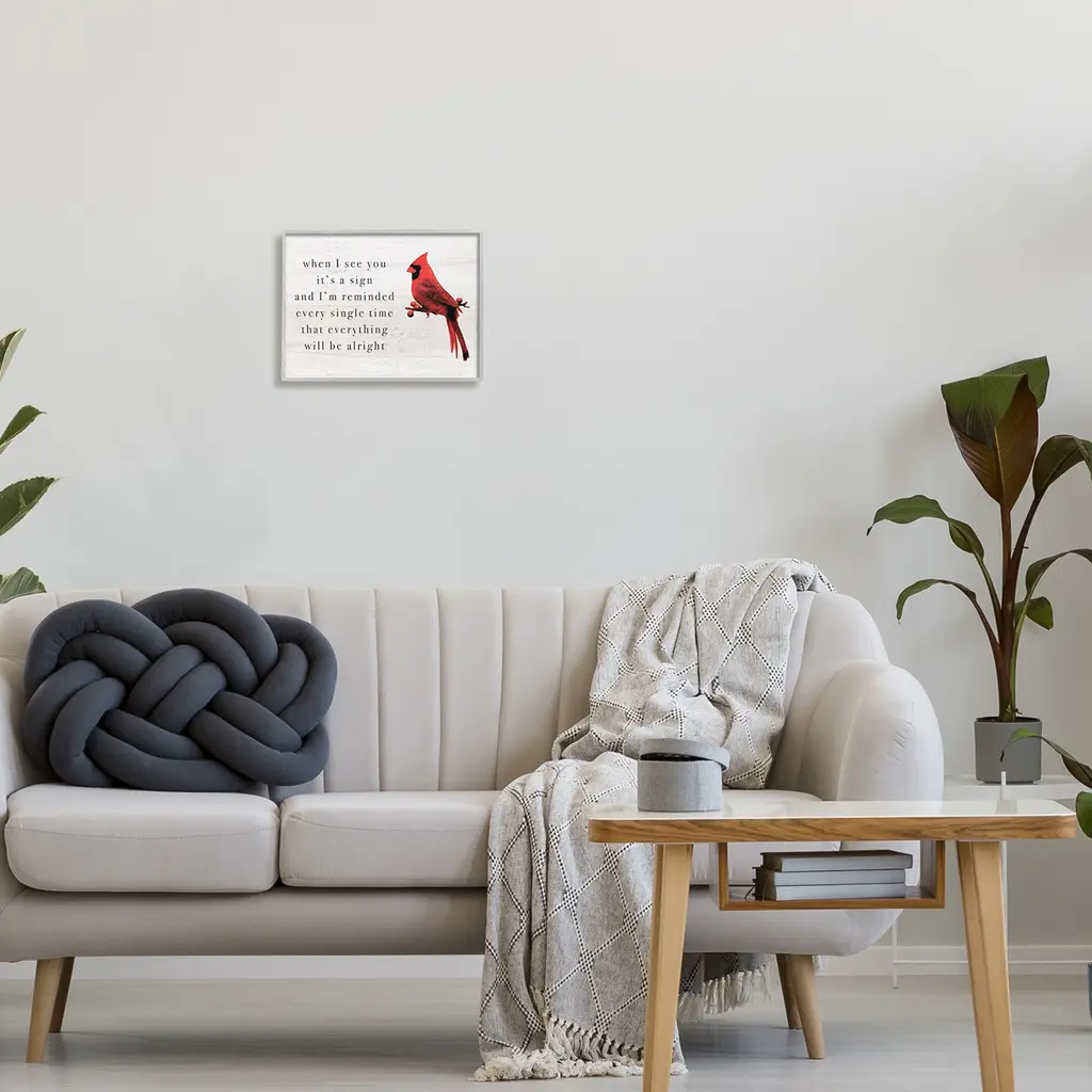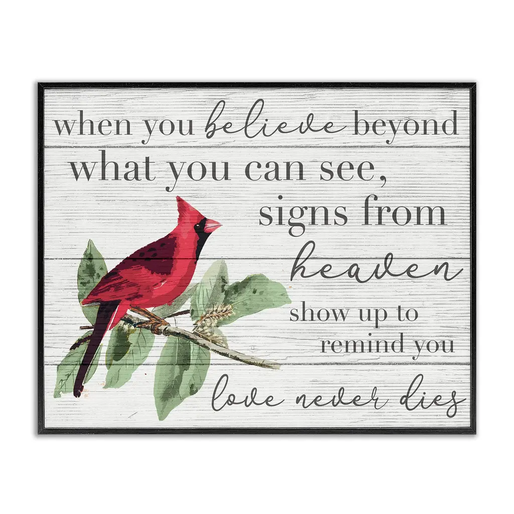 We create our stretched canvas to the highest standards. Using only the highest quality inks and canvas on Mimaki printers, we hand-cut and stretch each piece over a 1.5-inch thick wooden frame for hanging. As a result, the art comes ready to hang on the sturdy ledge with no installation required. Stupell Wall Art is made in the USA.Features: Dimensions: 20 x 1.5 x 16 InchesStretched Canvas Sizes Include Standard: 20 x 1.5 x 16 Large: 30 x 1.5 x 20 X-Large: 40 x 1.5 x 30 Oversized: 48 x 1.5 x 36Wall Art is Ready to Hang - No Installation or Hardware Needed. For Easy Set Up Lean or Layer Artwork on Shelf or Against Wall.Our stretched canvas is created with the highest standards. We use only the highest quality inks and canvas on our in house Mimaki printers, and then hand cut and stretch each piece over a 1.5 inch thick wooden frame for hanging. Made In USA.Artwork Relates To: Animal, Bird, Cardinal, Phrase, When I See You it's a Sign and I'm Reminded Every Single Time That Everything Will be AlrightDesign by Lil' Rue