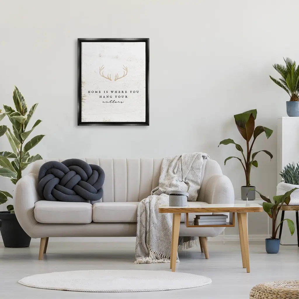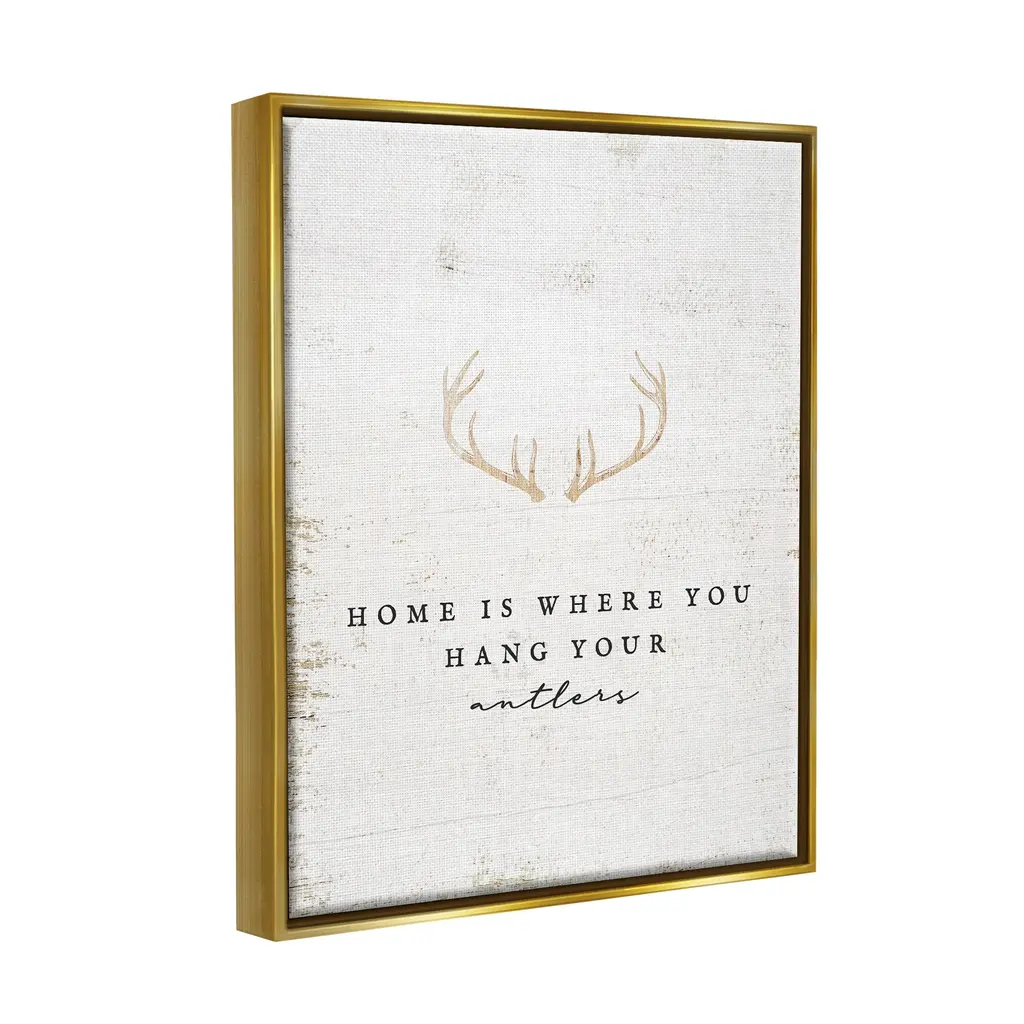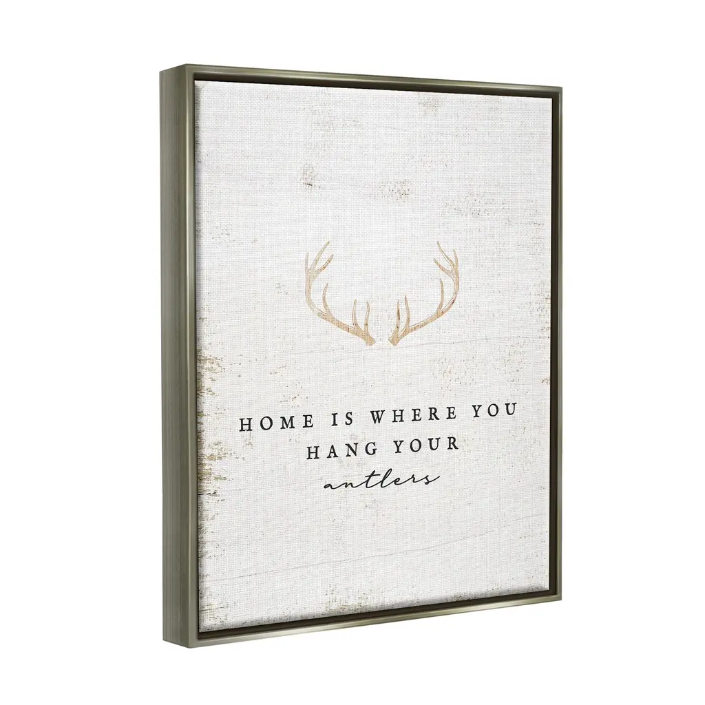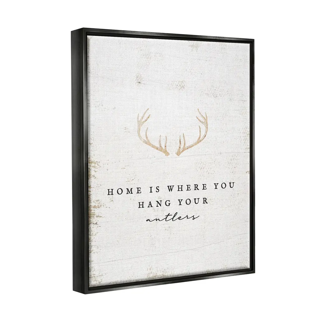 Elevate your home or office to the next level with Stupell Framed Floating Canvas Wall Art. Our premium hand-stretched canvas is mounted securely into a sturdy lightweight frame. The museum-style gap between the wrapped canvas and the box frame gives the illusion of floating artwork. Stupell Wall Art is made in the USA.Features: Dimensions: 17 x 1.7 x 21 Frame, 16 x 1.5 x 20 Canvas ArtFloating Frame Sizes Include Standard: 17 x 1.7 x 21 Oversized: 25 x 1.7 x 31Wall Art is Ready to Hang - No Installation or Hardware Needed. For Easy Set Up Lean or Layer Artwork on Shelf or Against Wall.Our elevated 1.7" Thick Floating Frame is the perfect complement to our canvas style Wall Art. We use only the highest quality inks in house with industry leading printing solutions. Canvas is hand stretched over a durable wood foundation and then mounted securly into a Modern Box Frame. Made in the USA.Artwork Relates To: Antler, Animal, Deer, Mammal, Wildlife, Hunting, Home Is Where You Hang Your AntlersDesign by Lil' Rue