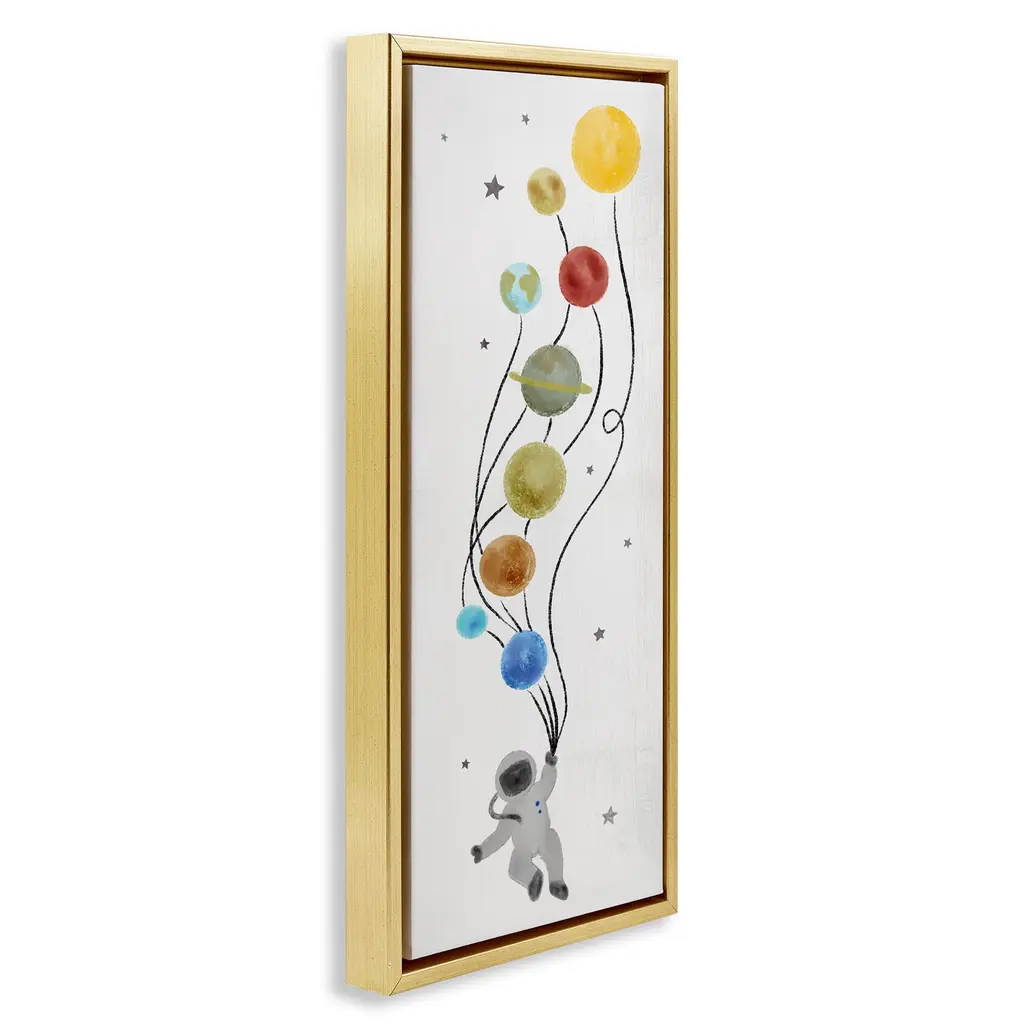Elevate your home or office to the next level with Stupell Framed Floating Canvas Wall Art. Our premium hand-stretched canvas is mounted securely into a sturdy lightweight frame. The museum-style gap between the wrapped canvas and the box frame gives the illusion of floating artwork. Stupell Wall Art is made in the USA.Features: Dimensions: 11 x 1.7 x 25 Frame, 10 x 1.5 x 24 Canvas ArtFloating Frame Canvas Products are available in sizes 11"x25" and 14"x31". All Floating Frame Canvas Products have a 1.7" Depth.Wall Art is Ready to Hang with Hardware Free Hanging. No Installation required. For Easy Set Up Lean or Layer Artwork on Shelf or Against Wall. Artwork is Permently Fixed into the Frame.Our elevated 1.7" Thick Floating Frame is the perfect complement to our canvas style Wall Art. We use only the highest quality inks in house with industry leading printing solutions. Canvas is hand stretched over a durable wood foundation and then mounted securly into a Modern Box Frame. Made in the USA.Artwork Relates To: Outer Space, Astronaut, Planets, Kids, Stars, Educational, BalloonDesign by Daphne Polselli