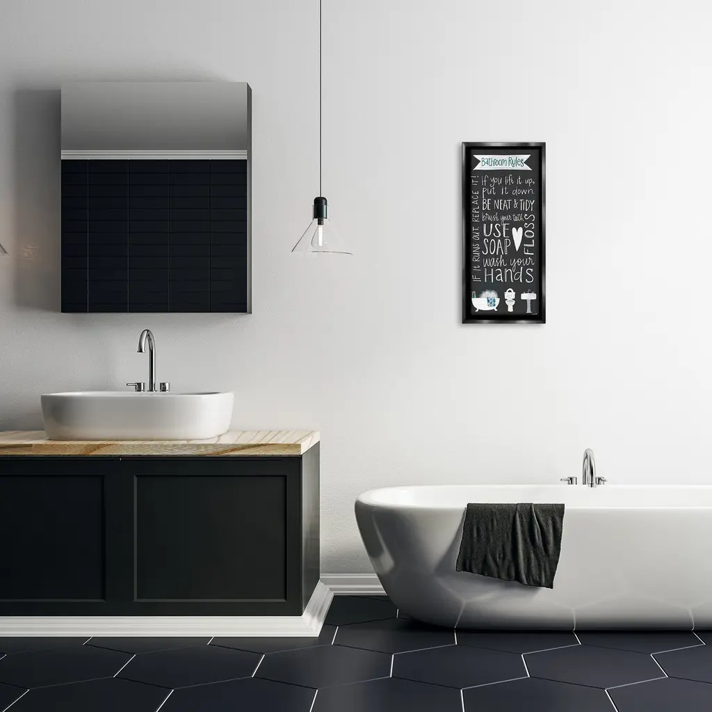 Stupell Whimsical Bathroom Rules Sign Framed Floater Canvas Wall Art Design By Katie Doucette - 11 X 25 - Black