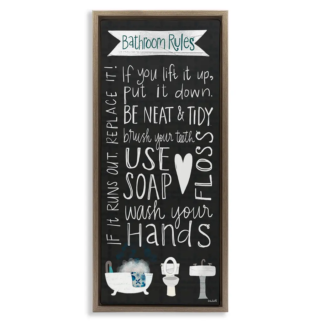 Elevate your home or office to the next level with Stupell Framed Floating Canvas Wall Art. Our premium hand-stretched canvas is mounted securely into a sturdy lightweight frame. The museum-style gap between the wrapped canvas and the box frame gives the illusion of floating artwork. Stupell Wall Art is made in the USA.Features: Dimensions: 11 x 1.7 x 25 Frame, 10 x 1.5 x 24 Canvas ArtFloating Frame Canvas Products are available in sizes 11"x25" and 14"x31". All Floating Frame Canvas Products have a 1.7" Depth.Wall Art is Ready to Hang with Hardware Free Hanging. No Installation required. For Easy Set Up Lean or Layer Artwork on Shelf or Against Wall. Artwork is Permently Fixed into the Frame.Our elevated 1.7" Thick Floating Frame is the perfect complement to our canvas style Wall Art. We use only the highest quality inks in house with industry leading printing solutions. Canvas is hand stretched over a durable wood foundation and then mounted securly into a Modern Box Frame. Made in the USA.Artwork Relates To: Bathroom, Rules, Phrase, Tub, Sink, Wash, HygieneDesign by Katie Doucette