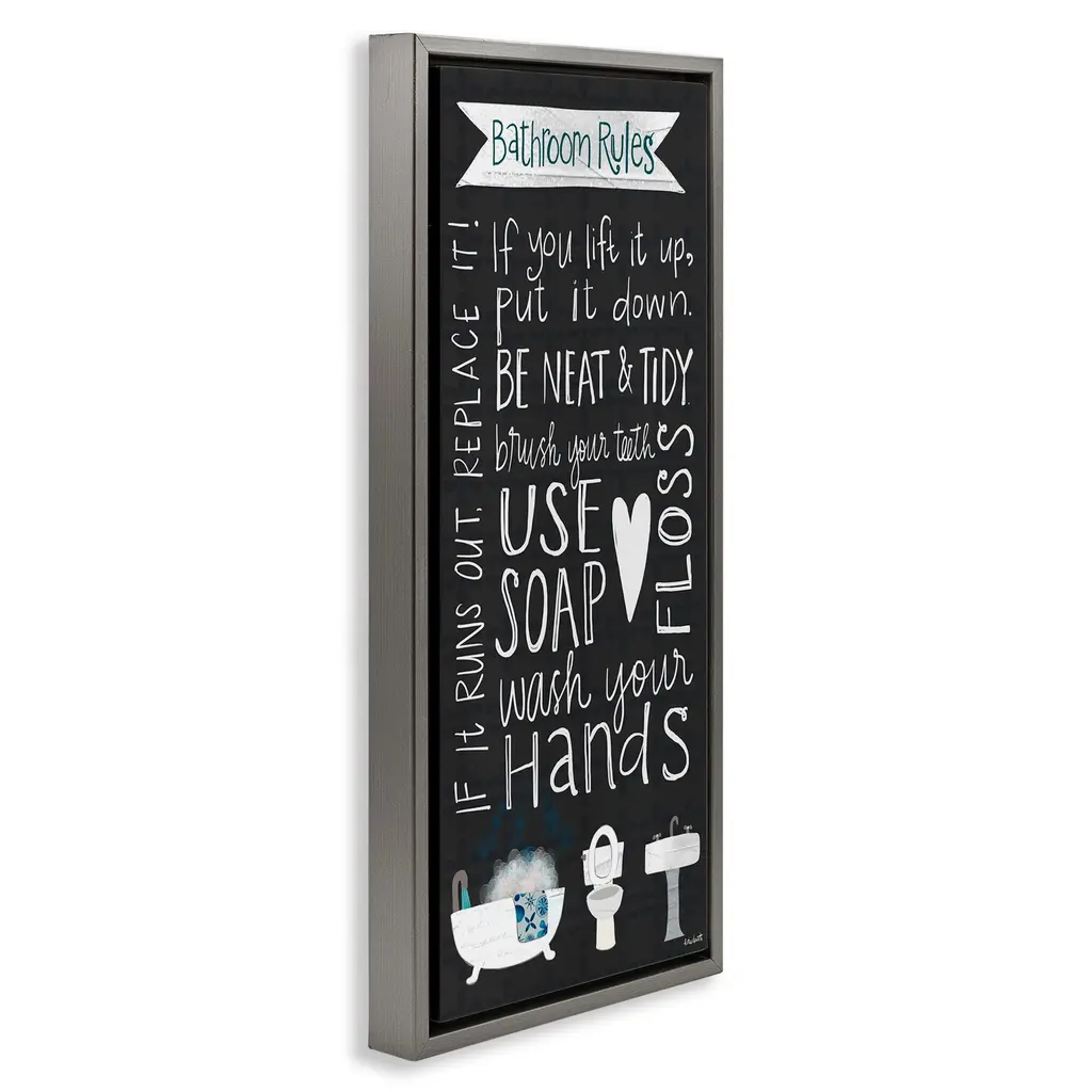 Elevate your home or office to the next level with Stupell Framed Floating Canvas Wall Art. Our premium hand-stretched canvas is mounted securely into a sturdy lightweight frame. The museum-style gap between the wrapped canvas and the box frame gives the illusion of floating artwork. Stupell Wall Art is made in the USA.Features: Dimensions: 11 x 1.7 x 25 Frame, 10 x 1.5 x 24 Canvas ArtFloating Frame Canvas Products are available in sizes 11"x25" and 14"x31". All Floating Frame Canvas Products have a 1.7" Depth.Wall Art is Ready to Hang with Hardware Free Hanging. No Installation required. For Easy Set Up Lean or Layer Artwork on Shelf or Against Wall. Artwork is Permently Fixed into the Frame.Our elevated 1.7" Thick Floating Frame is the perfect complement to our canvas style Wall Art. We use only the highest quality inks in house with industry leading printing solutions. Canvas is hand stretched over a durable wood foundation and then mounted securly into a Modern Box Frame. Made in the USA.Artwork Relates To: Bathroom, Rules, Phrase, Tub, Sink, Wash, HygieneDesign by Katie Doucette