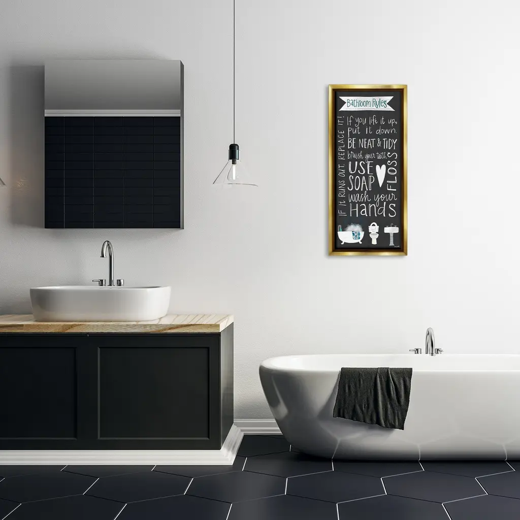 Elevate your home or office to the next level with Stupell Framed Floating Canvas Wall Art. Our premium hand-stretched canvas is mounted securely into a sturdy lightweight frame. The museum-style gap between the wrapped canvas and the box frame gives the illusion of floating artwork. Stupell Wall Art is made in the USA.Features: Dimensions: 11 x 1.7 x 25 Frame, 10 x 1.5 x 24 Canvas ArtFloating Frame Canvas Products are available in sizes 11"x25" and 14"x31". All Floating Frame Canvas Products have a 1.7" Depth.Wall Art is Ready to Hang with Hardware Free Hanging. No Installation required. For Easy Set Up Lean or Layer Artwork on Shelf or Against Wall. Artwork is Permently Fixed into the Frame.Our elevated 1.7" Thick Floating Frame is the perfect complement to our canvas style Wall Art. We use only the highest quality inks in house with industry leading printing solutions. Canvas is hand stretched over a durable wood foundation and then mounted securly into a Modern Box Frame. Made in the USA.Artwork Relates To: Bathroom, Rules, Phrase, Tub, Sink, Wash, HygieneDesign by Katie Doucette