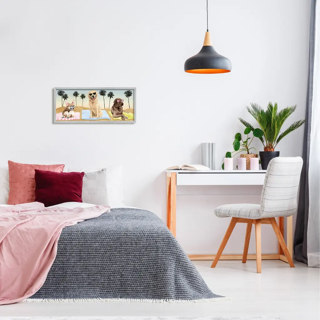 Stupell Whimsical Dogs Sunglasses Beach Towels Palm Trees Framed Wall Art - Multi-Color - 24 X 10 - Black